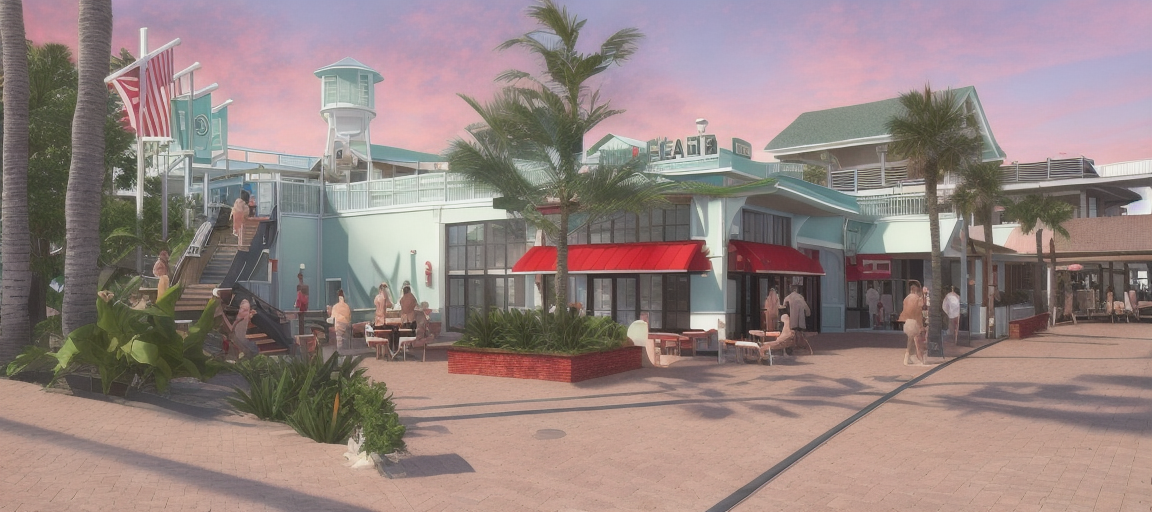 new urbanism exterior shot a daytime scene in florida of a cafe attached to a board walk with entertainment venues adjacent render this photorealistic canopies on cafe are red most of the other part of the building are white craftsman style roofs beyond are a light standing seam metal architecture