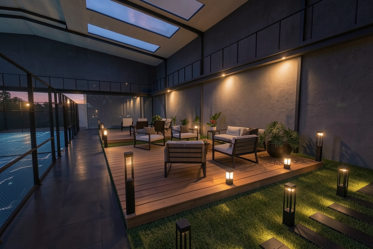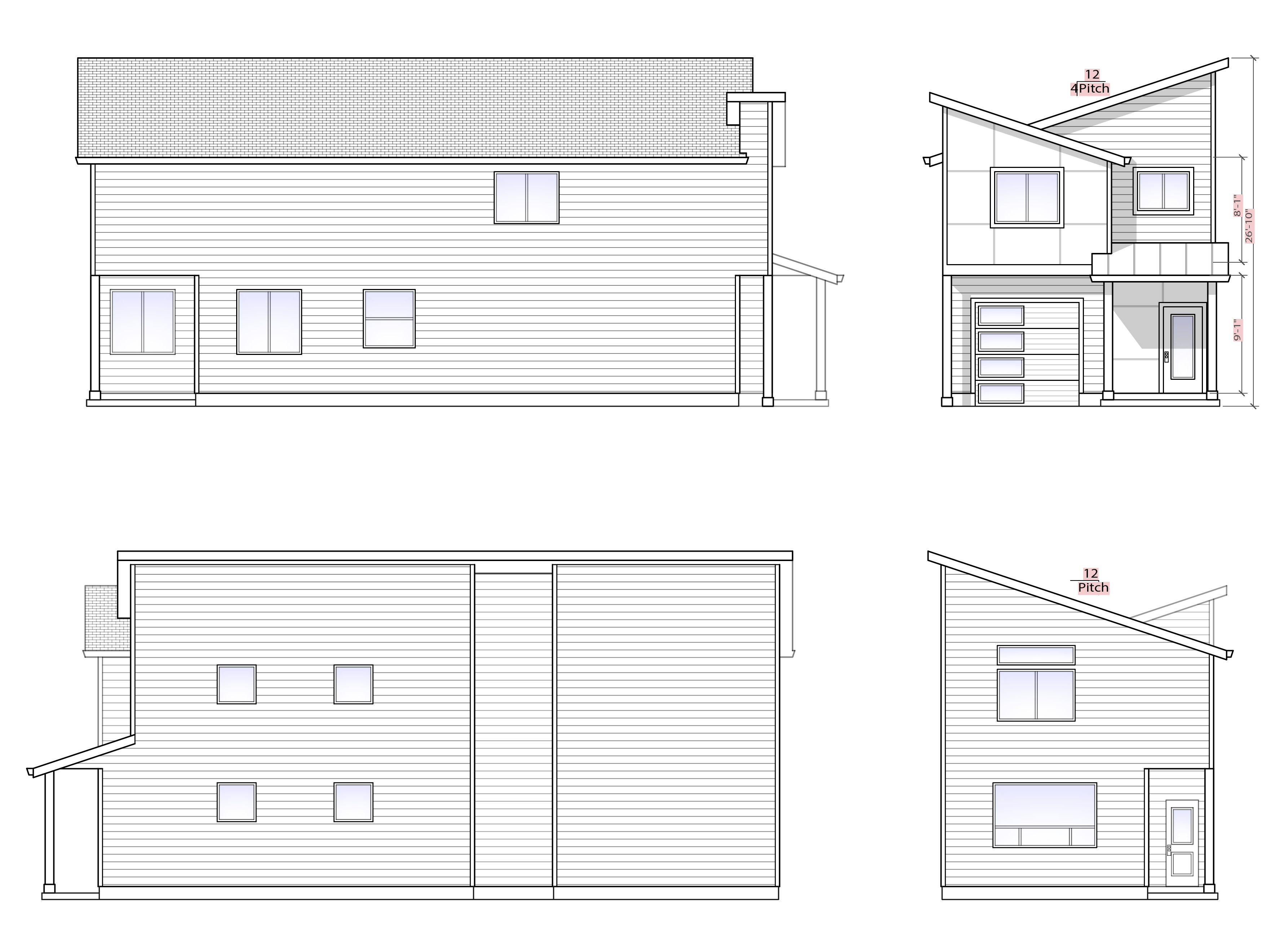 black siding doors and windows with dark gray trim rock landscape instead of grass for yard and fir trees