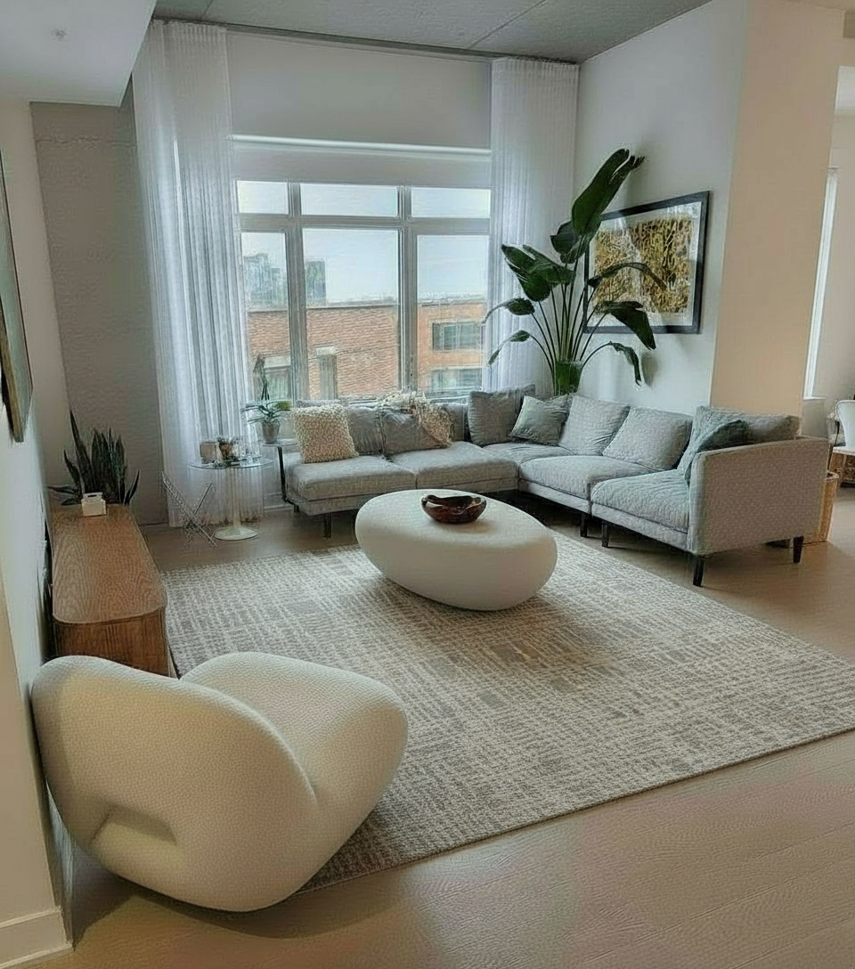 keep the photo exactly as it is preserving composition colors lighting and perspective only make the following changes move the plant to behind the sofa to the right of the art