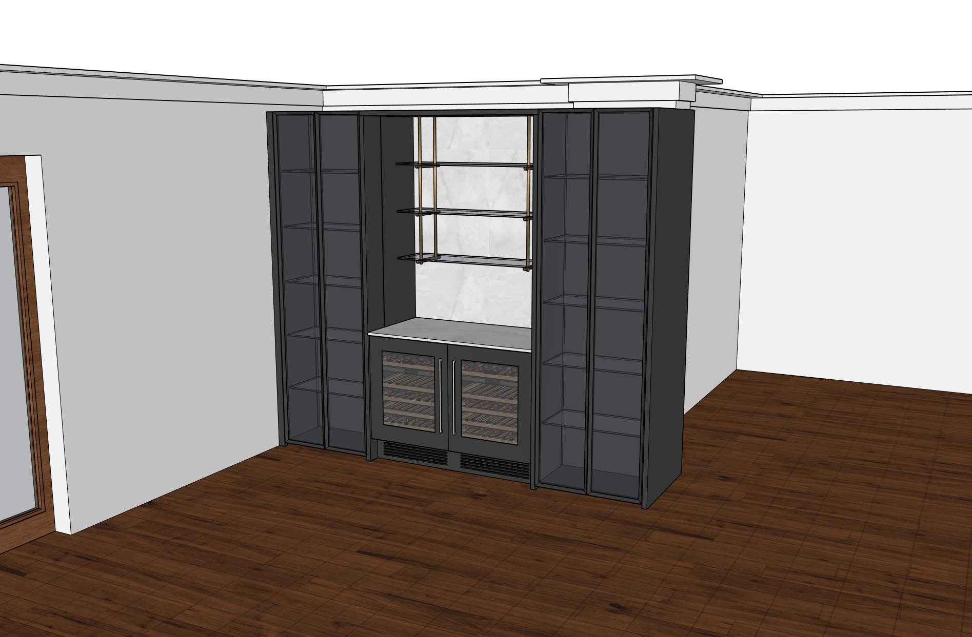 add realism to this image the tall cabinets should have internal vertical led lighting backlighting a selection of bottles on the shelves there should be 2 spotlights at the top of the central section and glasses on the suspended shelves