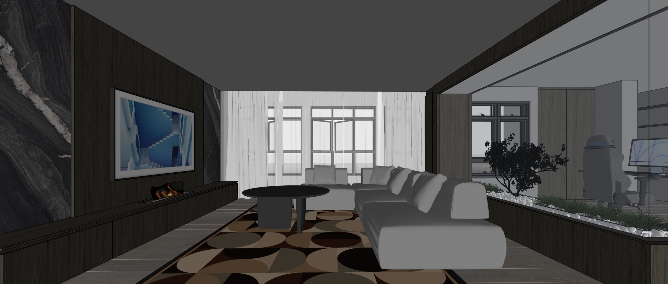 a modern kitchen with a minimalist design the cabinets are a crisp white with clean lines providing a sleek and contemporary look the wooden lower cabinets add warmth with a light oak finish the kitchen countertop is a smooth polished white marble reflecting a sense of elegance a black refrigerator complements the monochrome theme enhancing the minimalist aesthetic the dining area features a rustic light wood round table surrounded by comfortable gray fabric chairs the floor is a light gray wood adding to the airy open atmosphere large windows bring in natural light creating a bright welcoming environment the overall atmosphere is serene and harmonious with a perfect balance of modernity and comfort