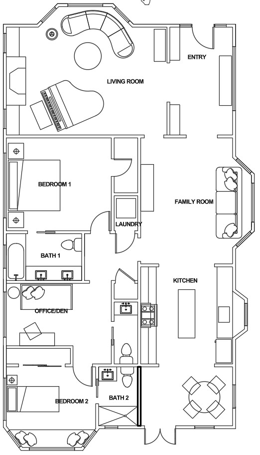 convert this floor plan into a realistic isometric 3d view of a full house show the space from an elevated angle with furniture walls and details visible romantic cottage style family home with hardwood floors and marble tile in bathrooms light colors use the same furniture as shows on the plan do not change the orientation of the floorplan