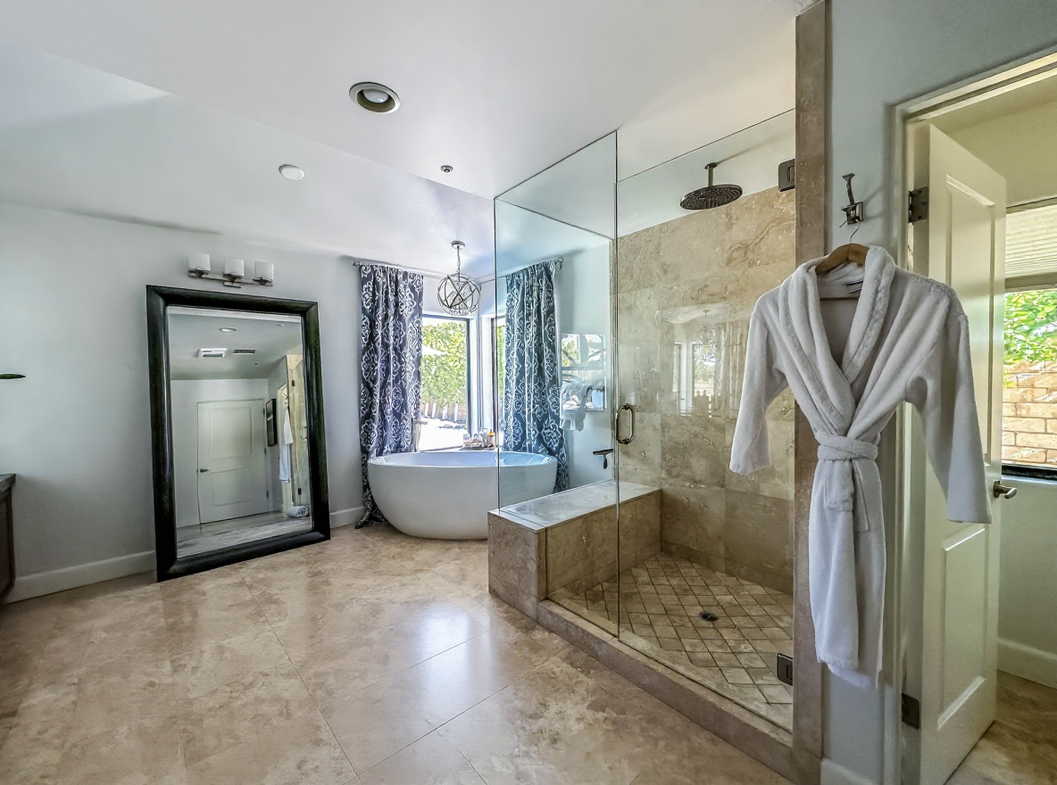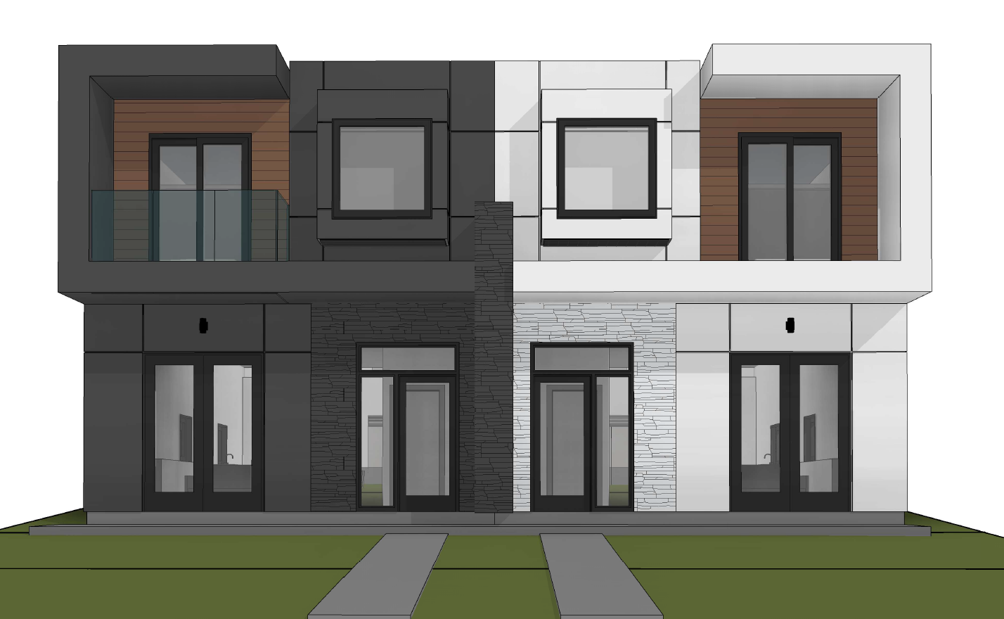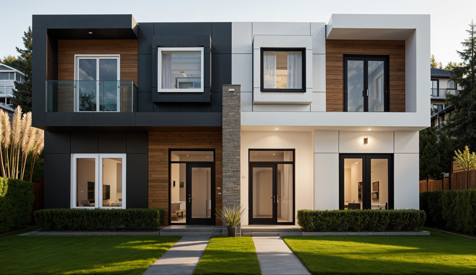 modern minimalist house with a sleek geometric duplex facade the exterior is a blend of charcoal gray white and natural wood tones the surface is smooth and polished with large floor to ceiling windows that provide a sense of openness balconies feature glass railings adding a touch of transparency and elegance the surrounding landscape includes lush green manicured lawns creating a serene and inviting atmosphere the sky is a clear blue with soft diffused sunlight casting gentle shadows enhancing the modern architectural design lush seattle neighbourhood contemporary prairie style landscape with pampas grasses and cedars