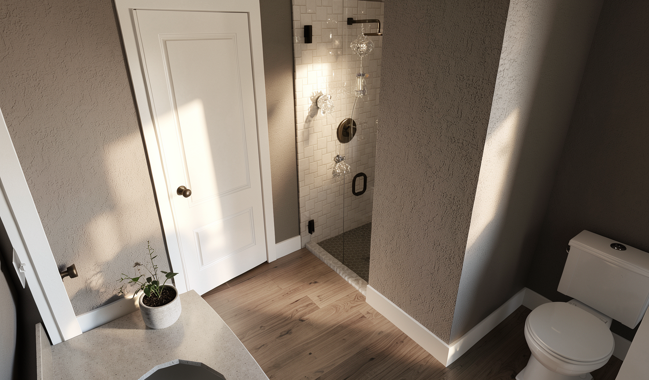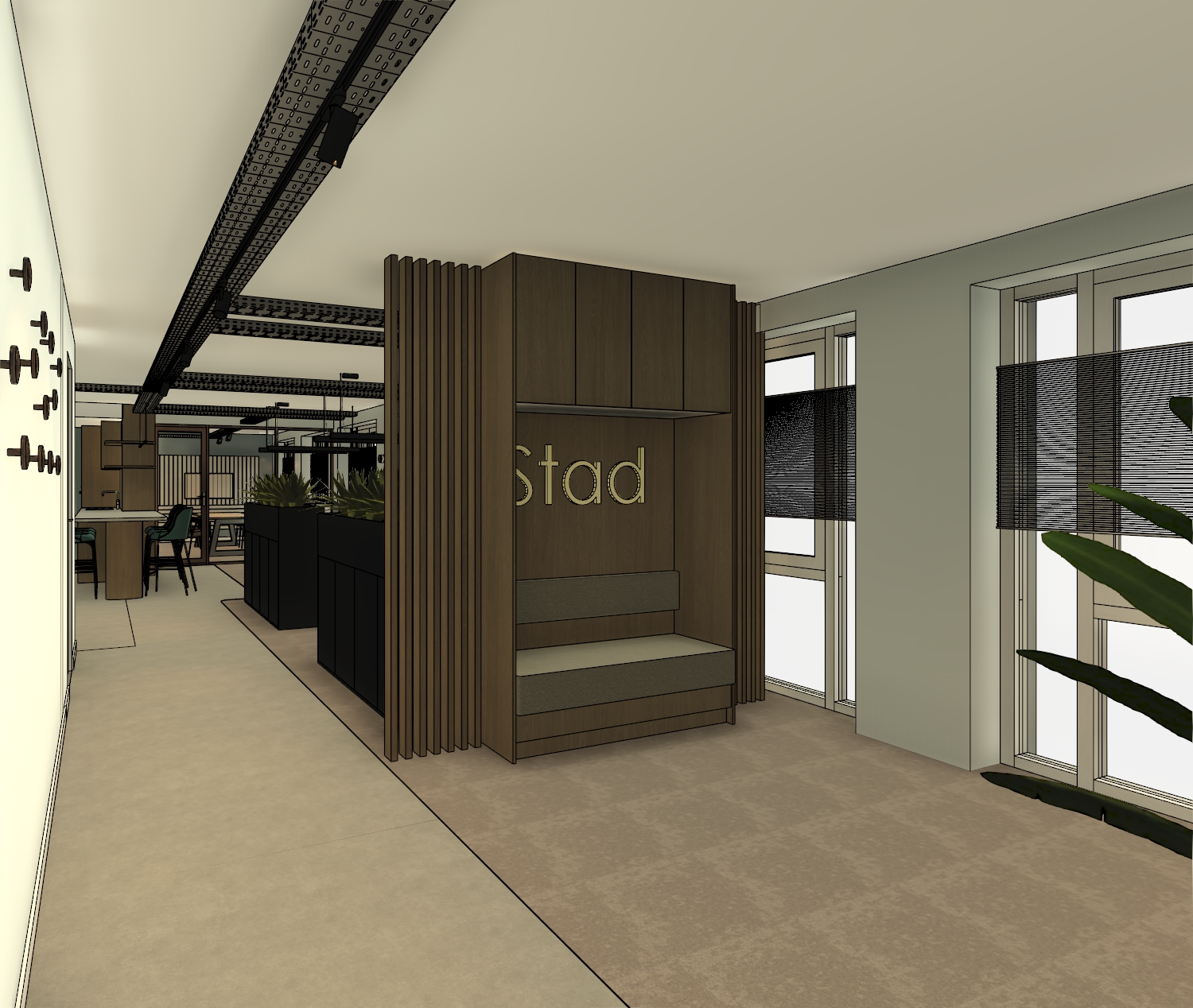 de wanden moeten heel licht grijs blauw zijn de vloer aan de rechterzijde is laagpolig beige bruin tapijt het plafond is grijs beton met ventilatiekanalen