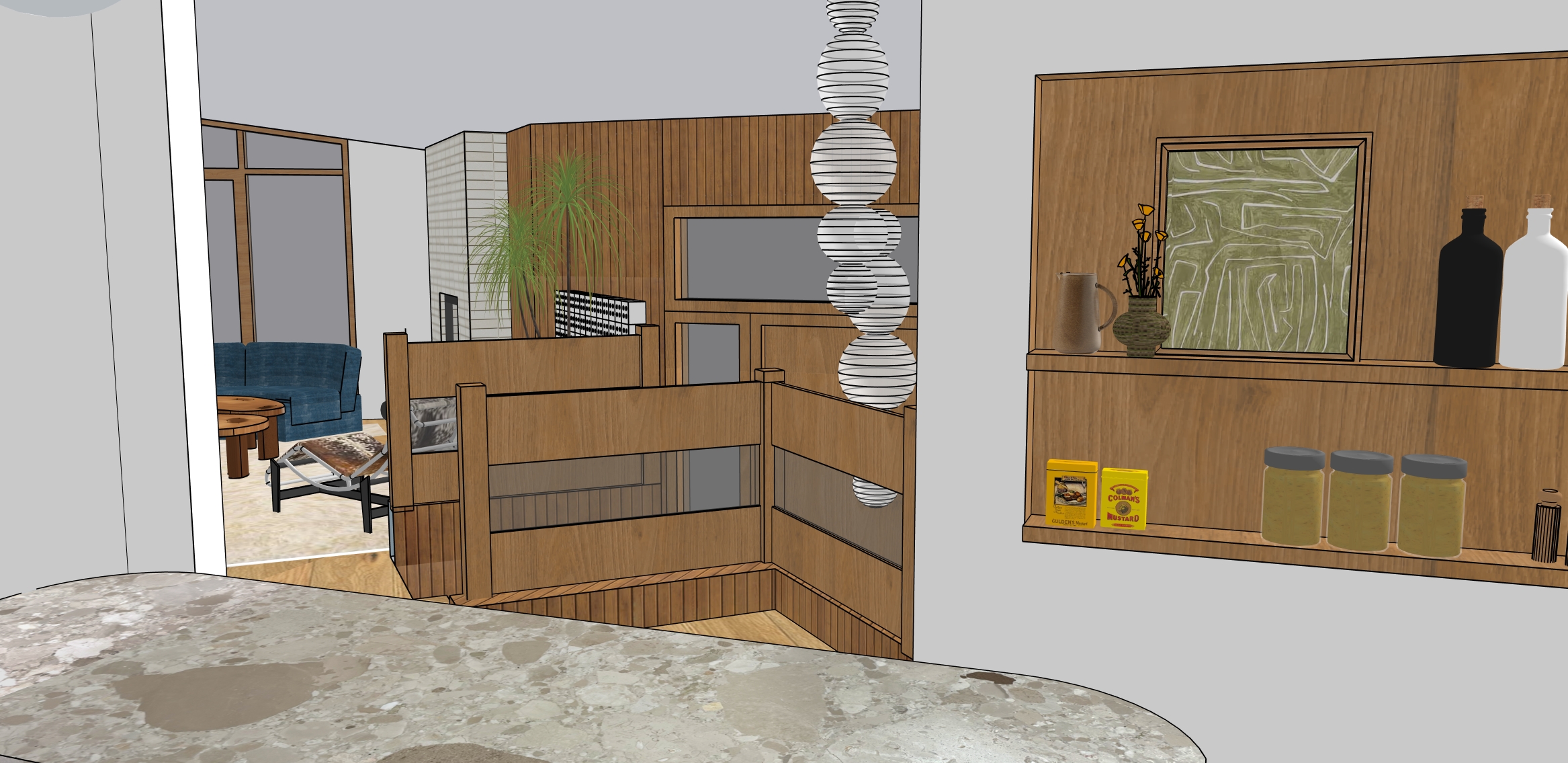 add wood cladding to ceiling make sure all wood colours are lighter make fireplace white brick