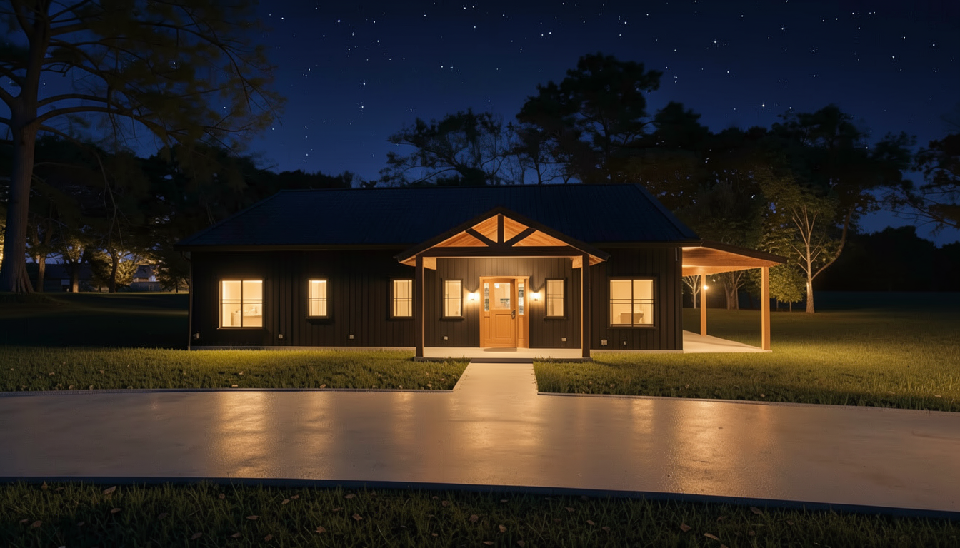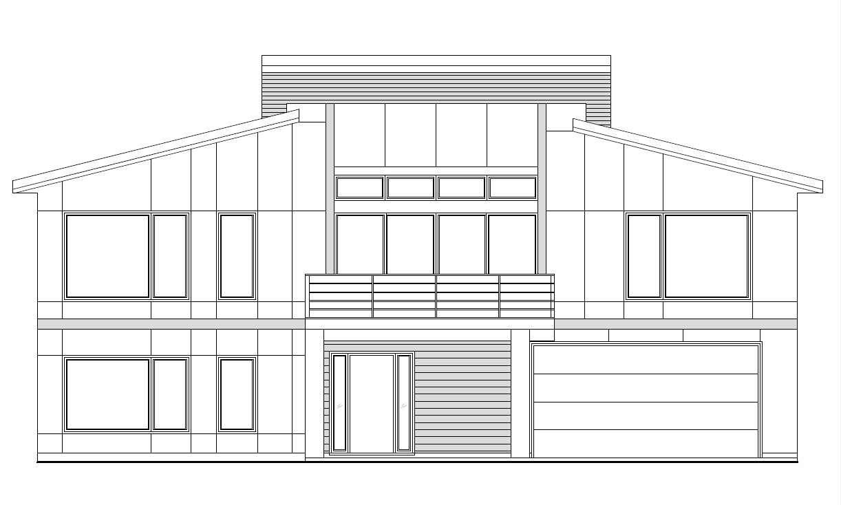white panel siding black fascia black railing horizontal railing on deck woodtone bellyband lux horizontal siding in fawn next to front door front door to match belly band wood soffit garage door in black roofline to come forward to cover deck deck windows plus one row of transom windows not 2 rows upper and lower deck posts to be in black