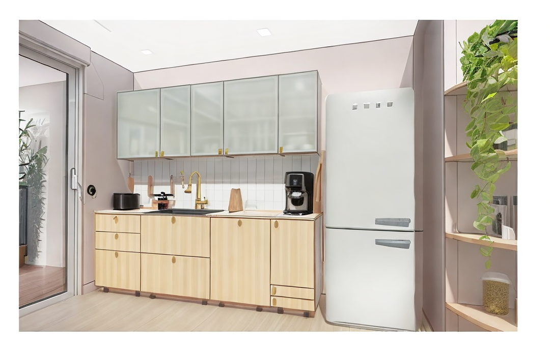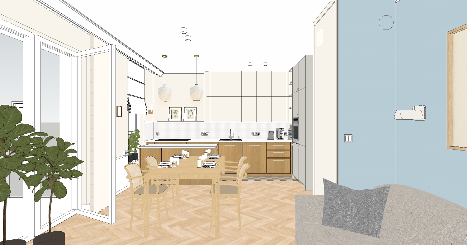 generate a realistic interior in a modern style with bright natural daylight lighting do not change any existing elements or color schemes the furniture should remain semi matte the upper part in a cashmere color with a slight rounding at the end the lower part of the cabinets made of oak veneer the flooring materials remain the same with tiles in the kitchen area as visible in the photo add lighting while maintaining coherence and realism throughout above the table place hanging lamps model lee from westwing https www westwing pl lampa wisz ca lee 100389 html they are glass on the ceiling keep the small white flush ceiling fixtures model gx53 grandi ip54 from led hurt https led hurt pl pl p oprawa sufitowa natynkowa gx53 grandi ip54 okragla biala 6690 do not change them the whole should look modern elegant and natural with realistic daylight lighting soft reflections and semi matte surface finishes as in the provided photo on the right side there should be mosaic tiles on the floor ending before the kitchen island then herringbone flooring the lamps should emit a soft glow do not change any lamps and colours they should remain as they are the lamp should be lit and cast the light in the room do not added any lamps add light to wall lamps and small ceiling lamps add led under the upper shelf