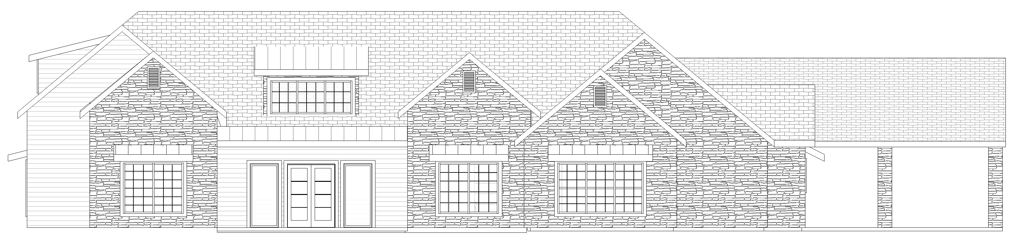 brown fieldstone stone walls with some gray stones siding will be dark brown dark charcoal roof shingles bronze metal canopies at porch and windows medium oak finish on doors and windows low shrubs and flowers around the front tall trees behind in house realistic look
