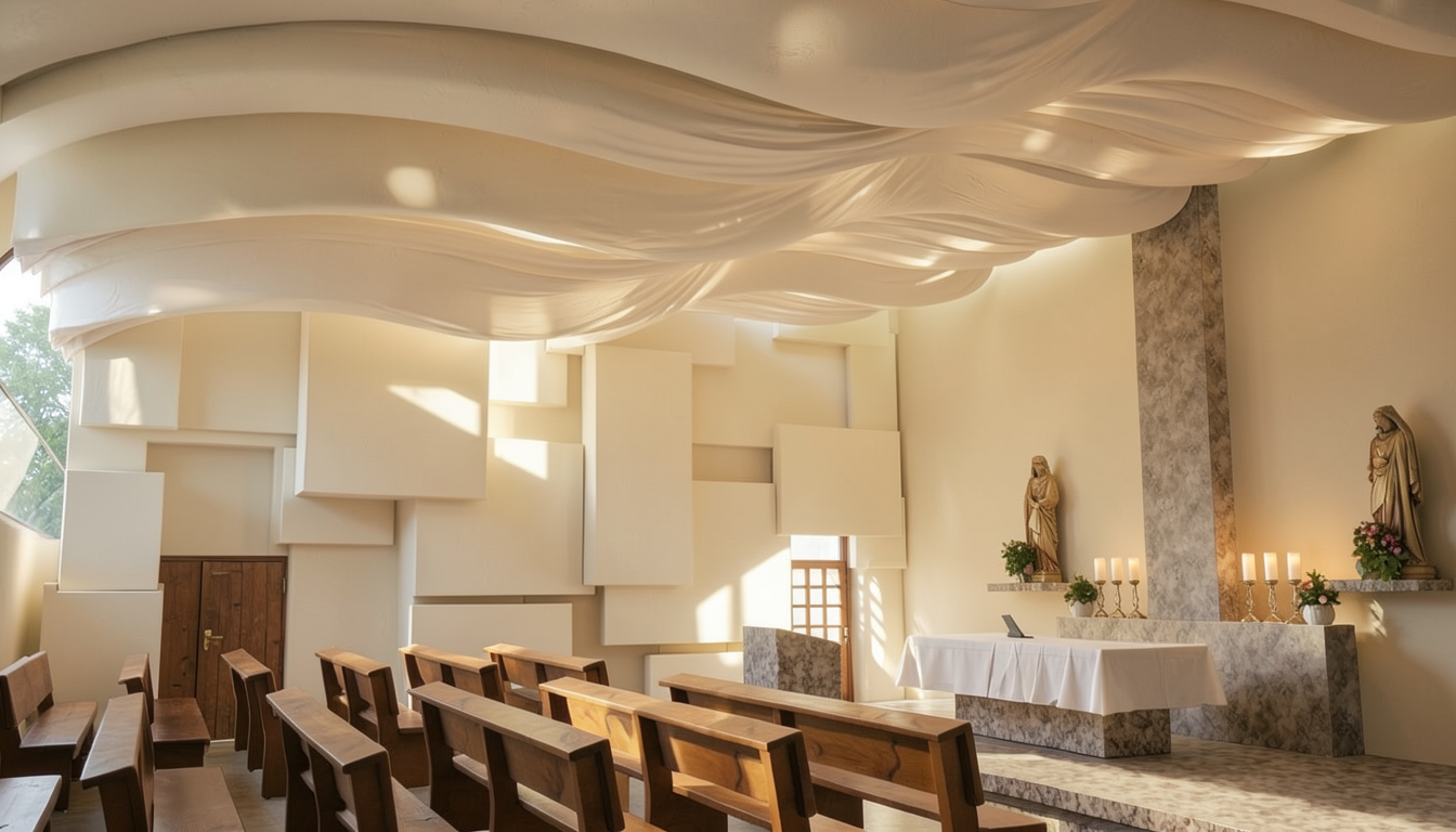 architectural render of a modern minimalist church featuring a dramatic roof made of curved white fabric modules tensile membrane structure the fabric should show realistic sagging and tension curves with slight translucency hyper realistic textures 8k resolution cinematic lighting shot on 35mm lens f 1 8 detailed shadows peaceful atmosphere delete all the outline of all the elements