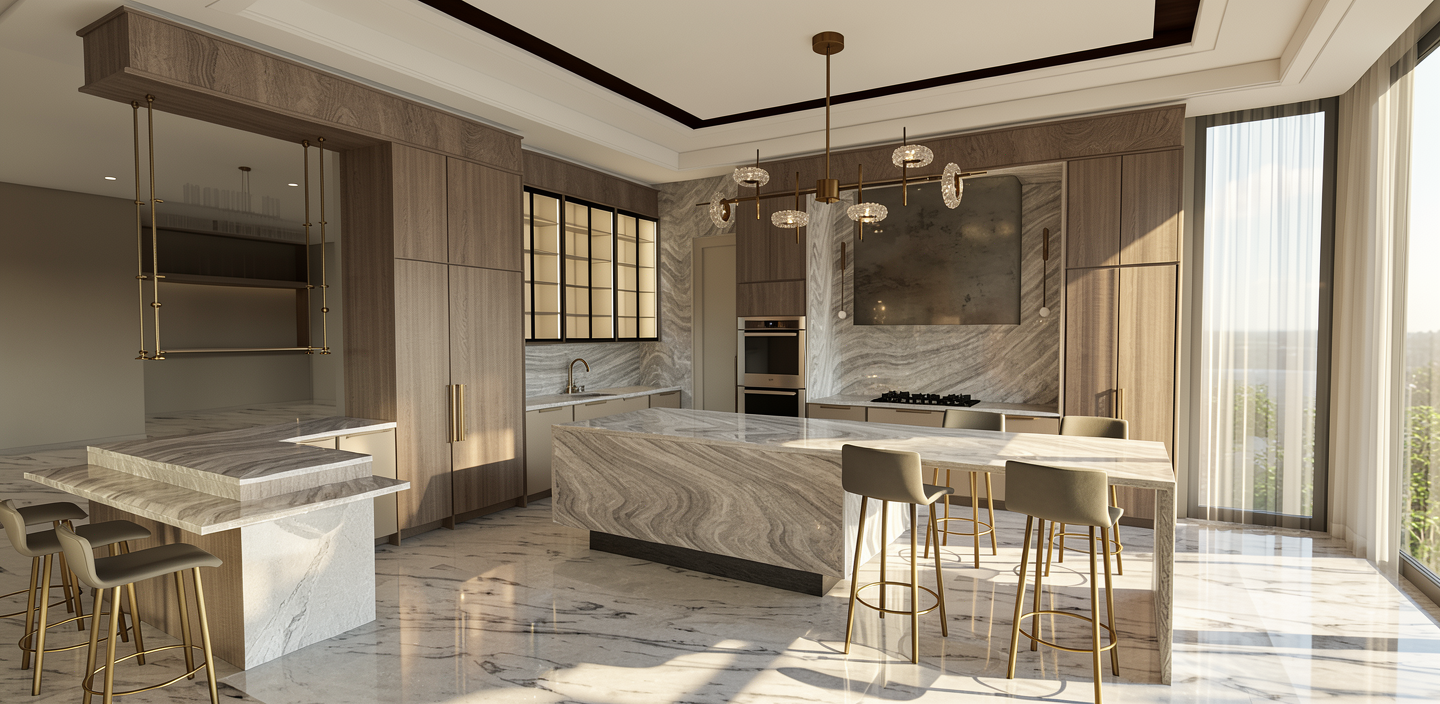 replace all existing marble surfaces with calacatta gold white marble keep all other materials lighting colors textures cabinetry and architectural details exactly the same do not change the design layout or styling only update the marble to calacatta gold white marble with realistic veining soft white base and warm gold accents