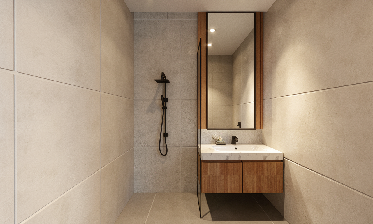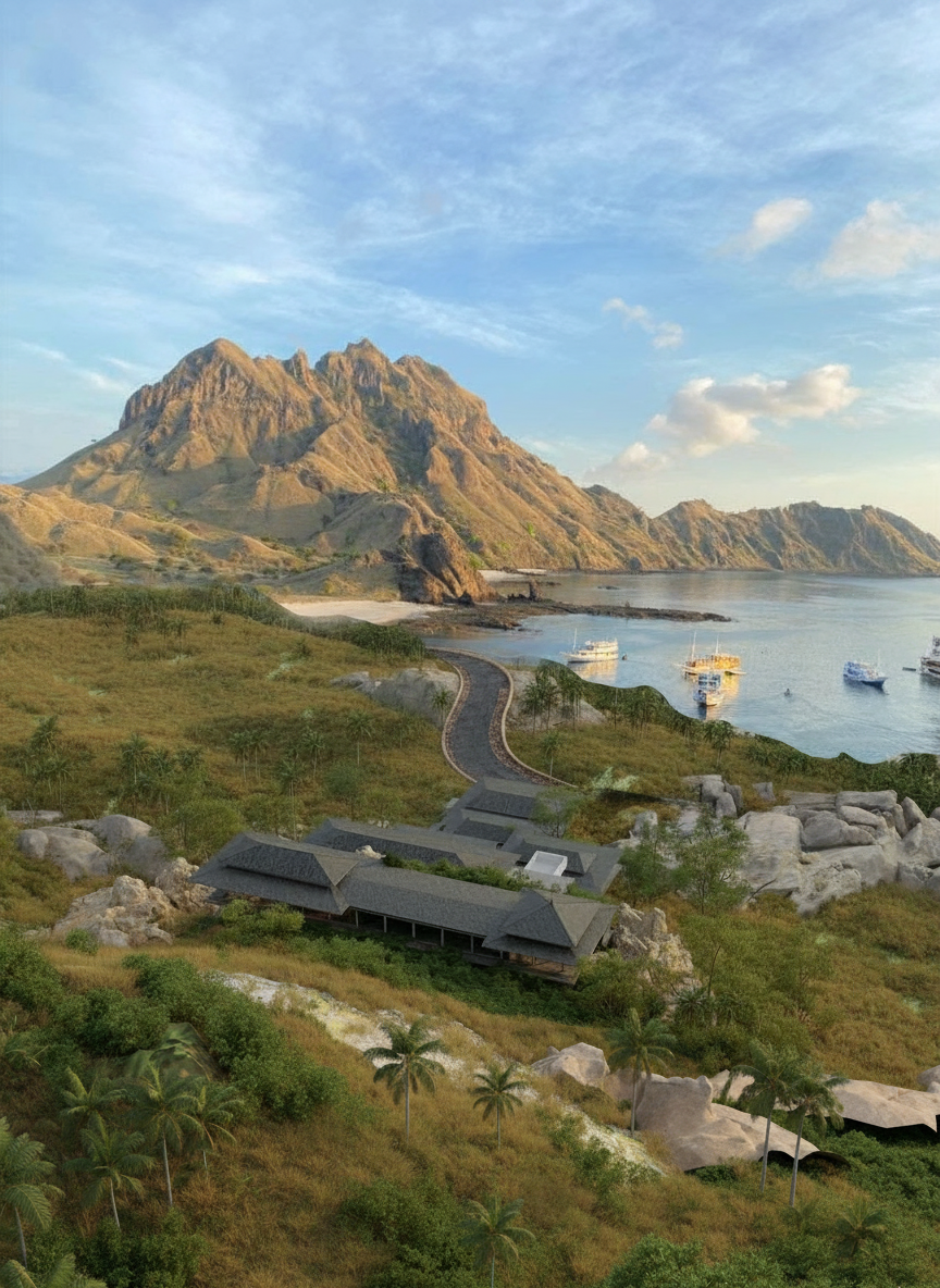 enhance the terrain environment while strictly maintaining the original building design structure materials proportions and layout do not modify the architecture roof geometry terrace arrangement or structural elements maintain the exact original top view camera angle camera height framing and perspective refine the existing terrain with minimal modification preserving the original landform and slope structure do not introduce new large terrain formations or drastically alter the landscape composition subtly enhance the terrain character to resemble natural labuan bajo hillside conditions inspired by grassy limestone ridges and layered tropical slopes while maintaining the existing terrain geometry improve terrain realism by refining surface textures using dry tropical grass scattered shrubs and small exposed stone patches blending naturally with the original ground conditions introduce very subtle limestone rock accents along natural slope transitions and near the building foundation to reinforce the impression that the structure sits naturally on rocky terrain enhance vegetation distribution using natural clustering placing slightly denser vegetation in lower slope areas and valleys while keeping upper slopes more open with grass dominant surfaces avoid adding excessive trees or forest density if visible from the top view subtly refine the distant coastline by introducing a gentle turquoise to deep blue water gradient ensuring the shoreline remains natural and not exaggerated blend all terrain transitions smoothly to maintain a soft and natural landscape continuity avoiding sharp edges or artificial looking terrain modifications
