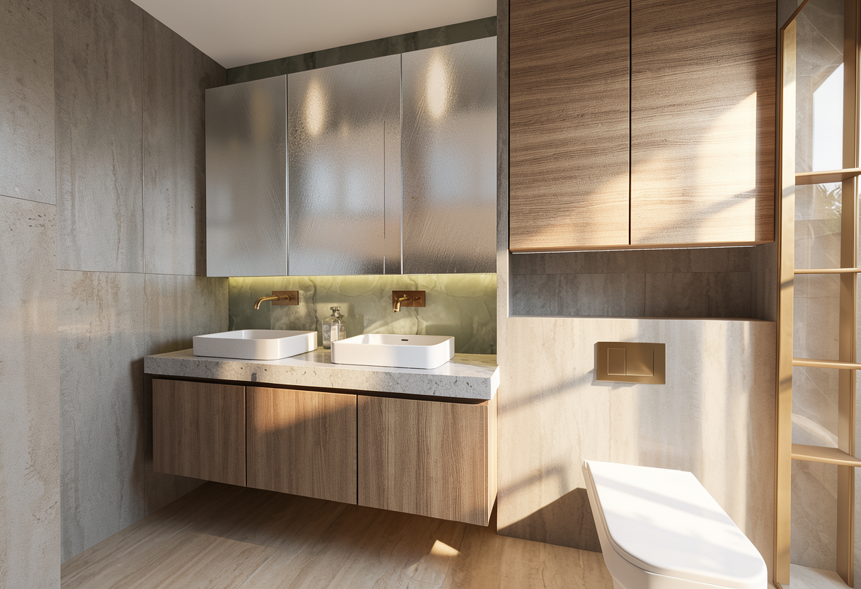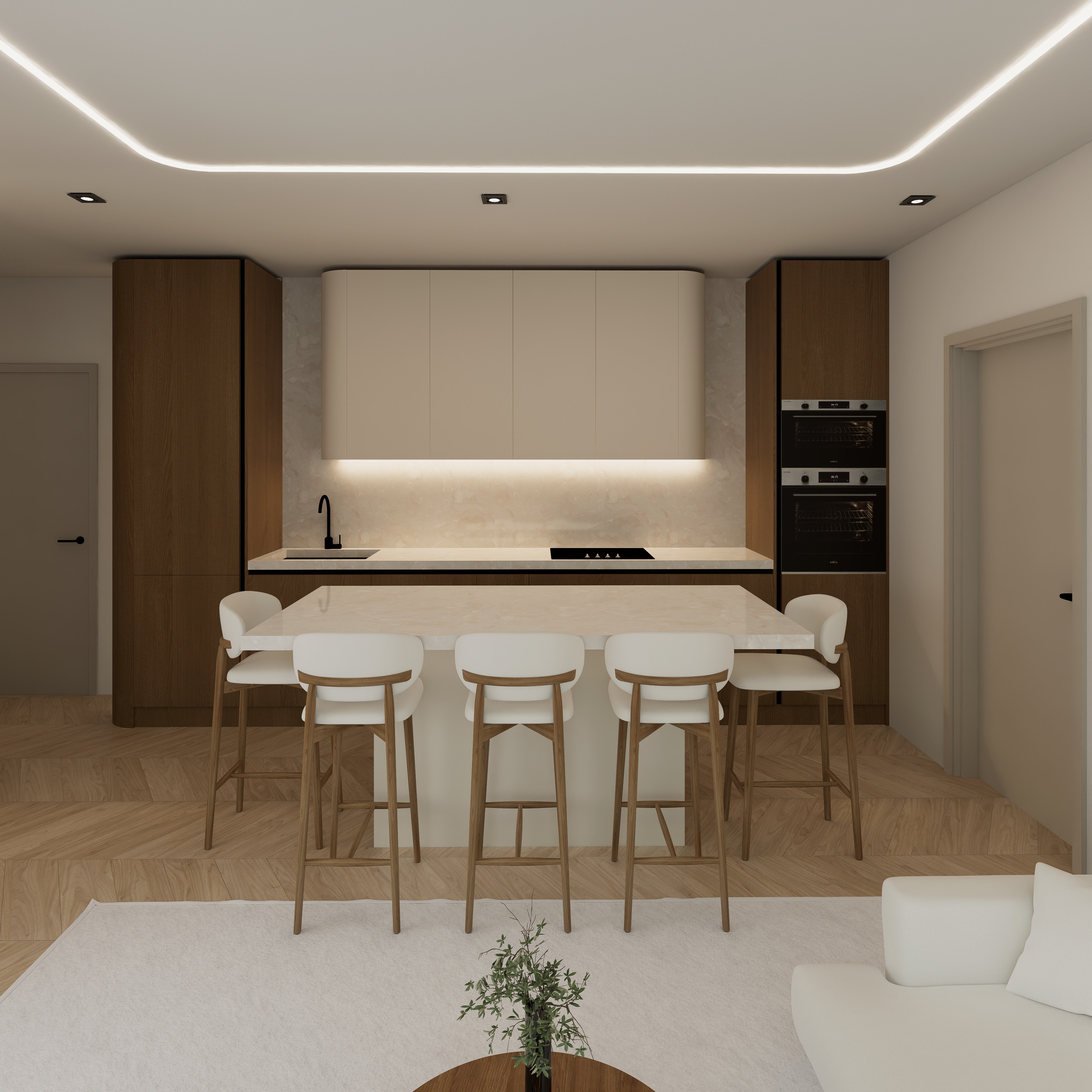ultra realistic interior render of a modern minimalist kitchen with island do not change the design layout proportions materials or camera angle enhance realism with physically accurate lighting and textures kitchen cabinets upper smooth matte cream finish soft touch surface subtle reflections side tall cabinets dark warm walnut wood veneer rich natural grain matte satin finish seamless lower elements island base same walnut veneer consistency countertop backsplash light beige stone with very subtle veining matte or honed finish not glossy island clean monolithic form soft rounded edges same stone on top bar stools light wood structure with soft cream upholstery natural fabric texture flooring light oak wood herringbone pattern matte finish with realistic grain variation lighting under cabinet led strip 3000k warm white soft indirect wash on backsplash ceiling recessed spots perimeter led 3000k smooth continuous glow natural daylight entering from living area front soft and diffused appliances oven microwave modern black glass finish slightly reflective but not mirror like cooktop minimal black surface integrated into countertop faucet sink matte black finish clean and sharp realism details add micro imperfections to wood and stone subtle roughness variation on cabinet surfaces soft shadows under stools and island ambient occlusion in corners and joints slight light falloff for depth overall warm neutral tone balance no yellow overcast clean high end architectural visualization cinematic but natural not overprocessed sharp but soft lighting transitions