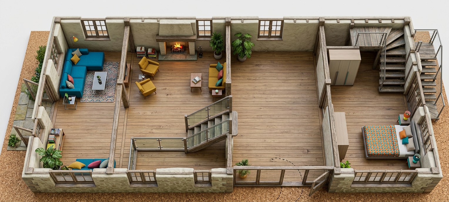 provide a photorealistic rendering keep all the elements proportions and materials as they are provide daylight through the glass only
