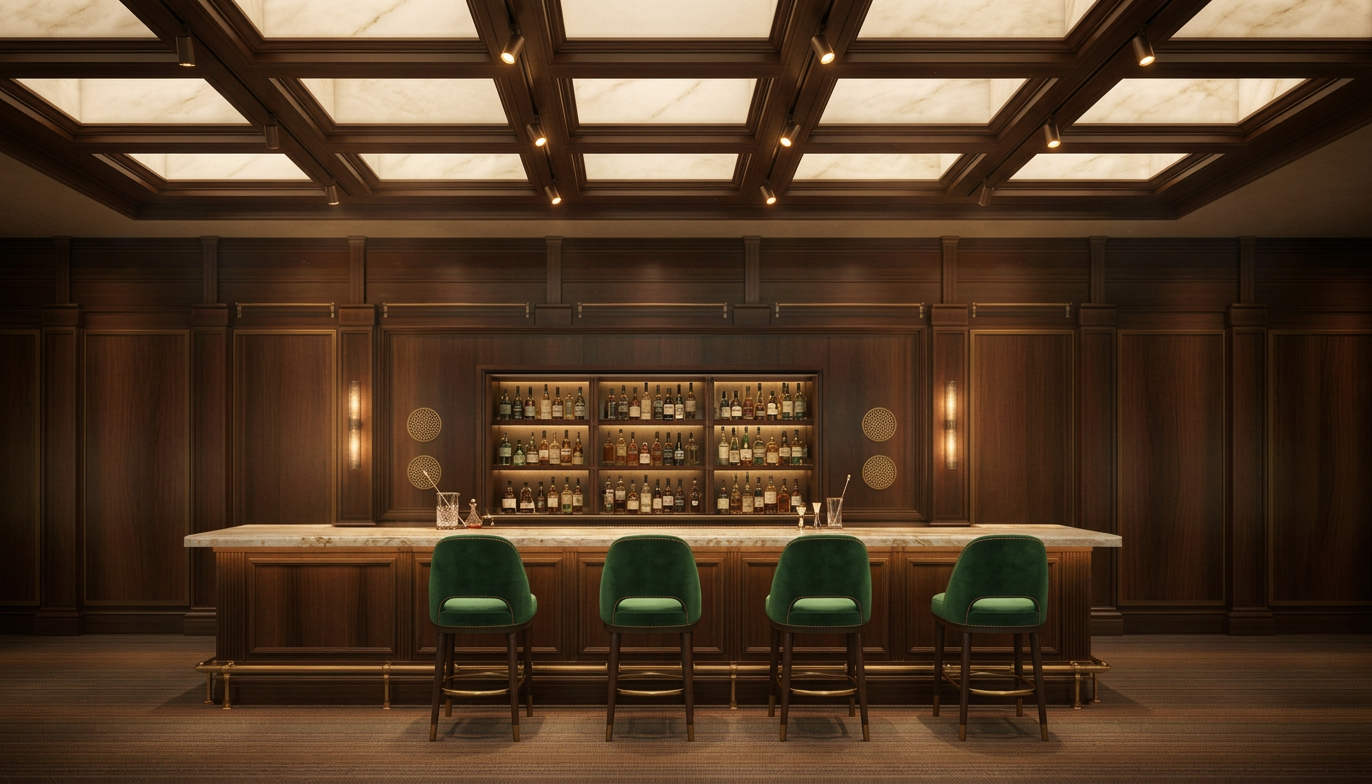 show a lighted cylindrical fixtures against the back wall one cylinder at both ends of back bar
