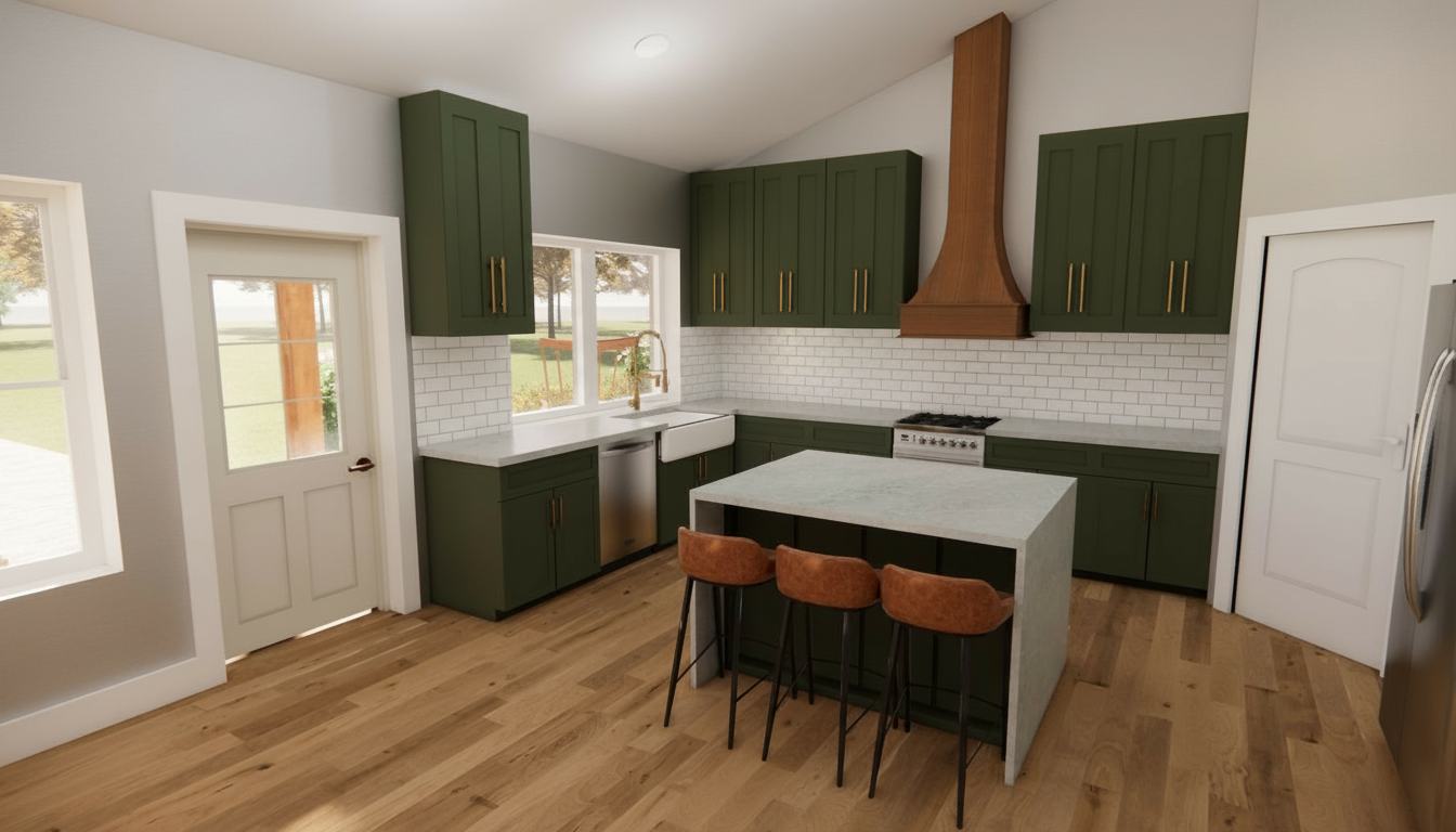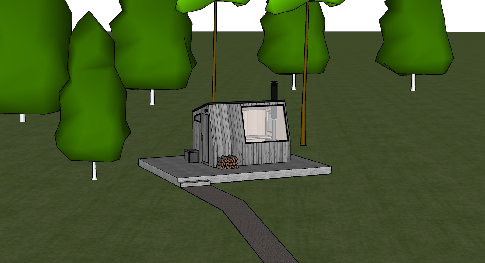 render a photorealistic 3d perspective of this sauna the current material style keep model geometry the same windows doors roof sky with light atmospheric depth render in hyper realistic architectural visualization quality 8k resolution