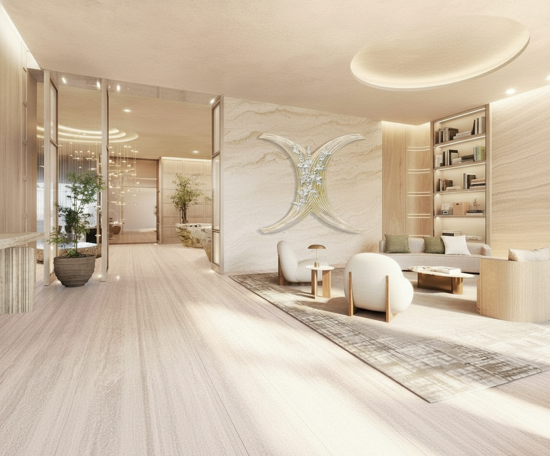 render a luxurious and modern bathroom with a soothing and elegant atmosphere the walls are textured with a soft white color while the ceiling is painted in a sleek gray the bathtub is a minimalist design in pure white featuring a sleek bronze faucet the windows are large with black frames allowing natural light to flood the space the shower has a glass door with a subtle blue tint bordered by elegant white and gray marble the floor is a continuation of marble featuring intricate gray veins on a lighter background the double vanity is crafted from rich dark wood complemented by elegant white sinks and a large frameless mirror soft ambient lighting creates a serene and welcoming atmosphere with hints of warm glow