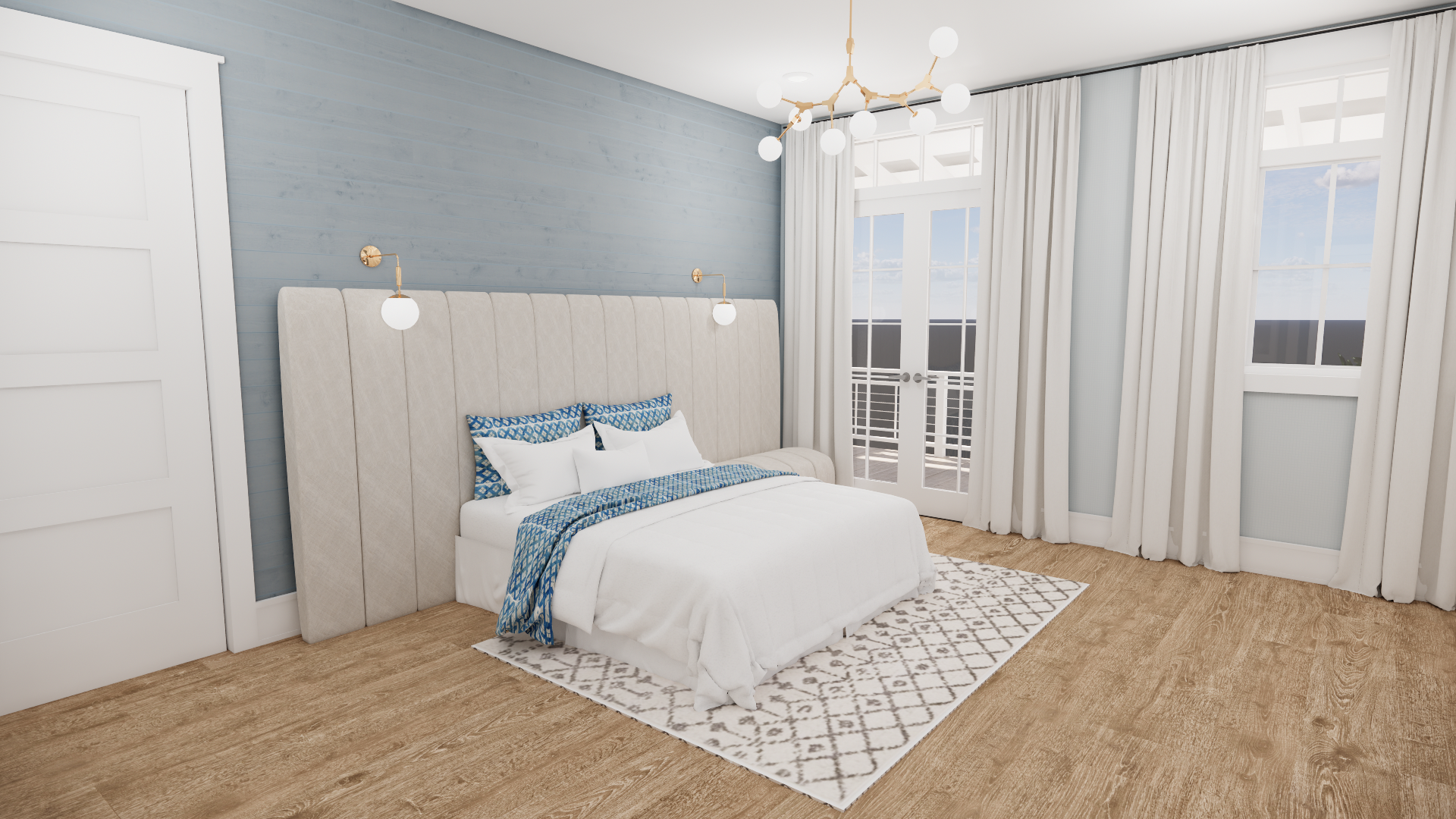 you are a professional image renderer you create the highest grade renderings around and specialize in architectural renderings this is an interior rendering of the master bedroom of a beach house create a high resolution photorealistic image of this room keep the windows as they are where they are keep the doors as they are where they are keep the main structure as it is where it is feel free to change the perspective keep the ceiling as it is where is it do not add anything to the structure that i have not asked for you can see the beach out the windows