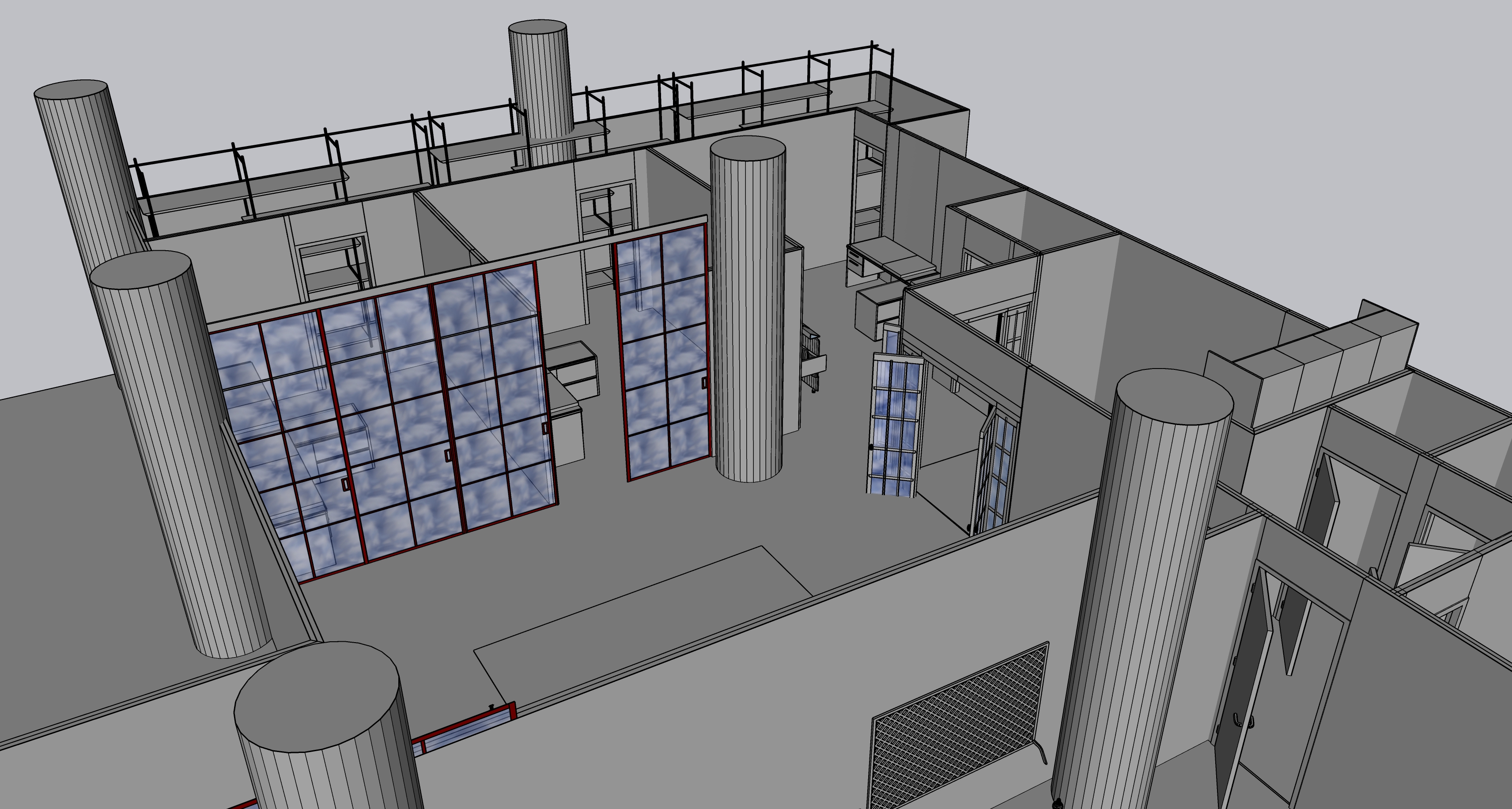 industrial seamstress workshop grey floor concrete walls and columns black framed glass doors facade window frames green