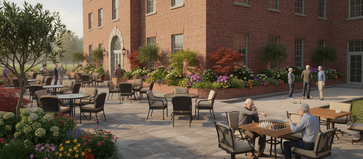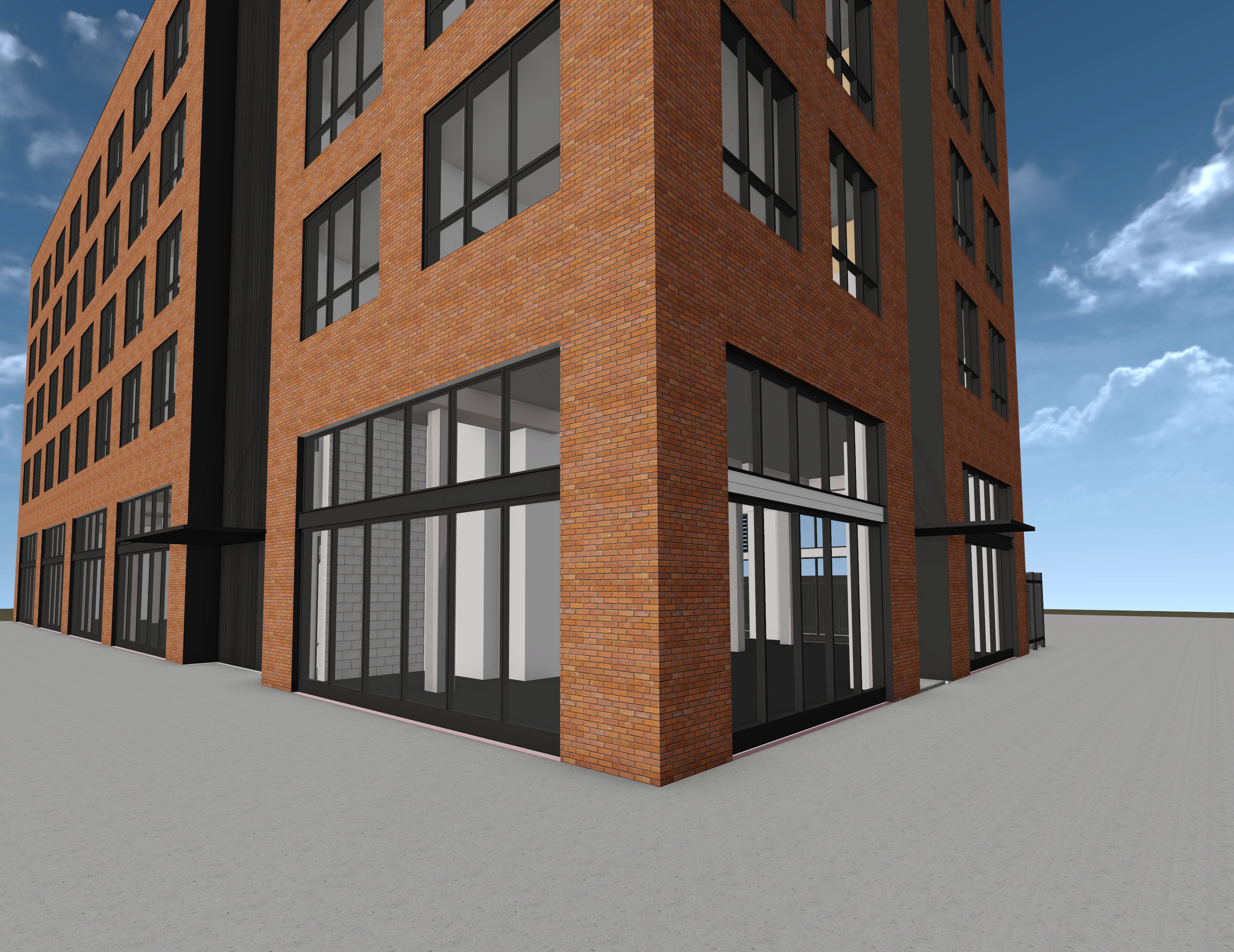 photo realistic brick pavers next to the building then a 5 sidewalk then brick pavers out to the street tall trees in the right of way