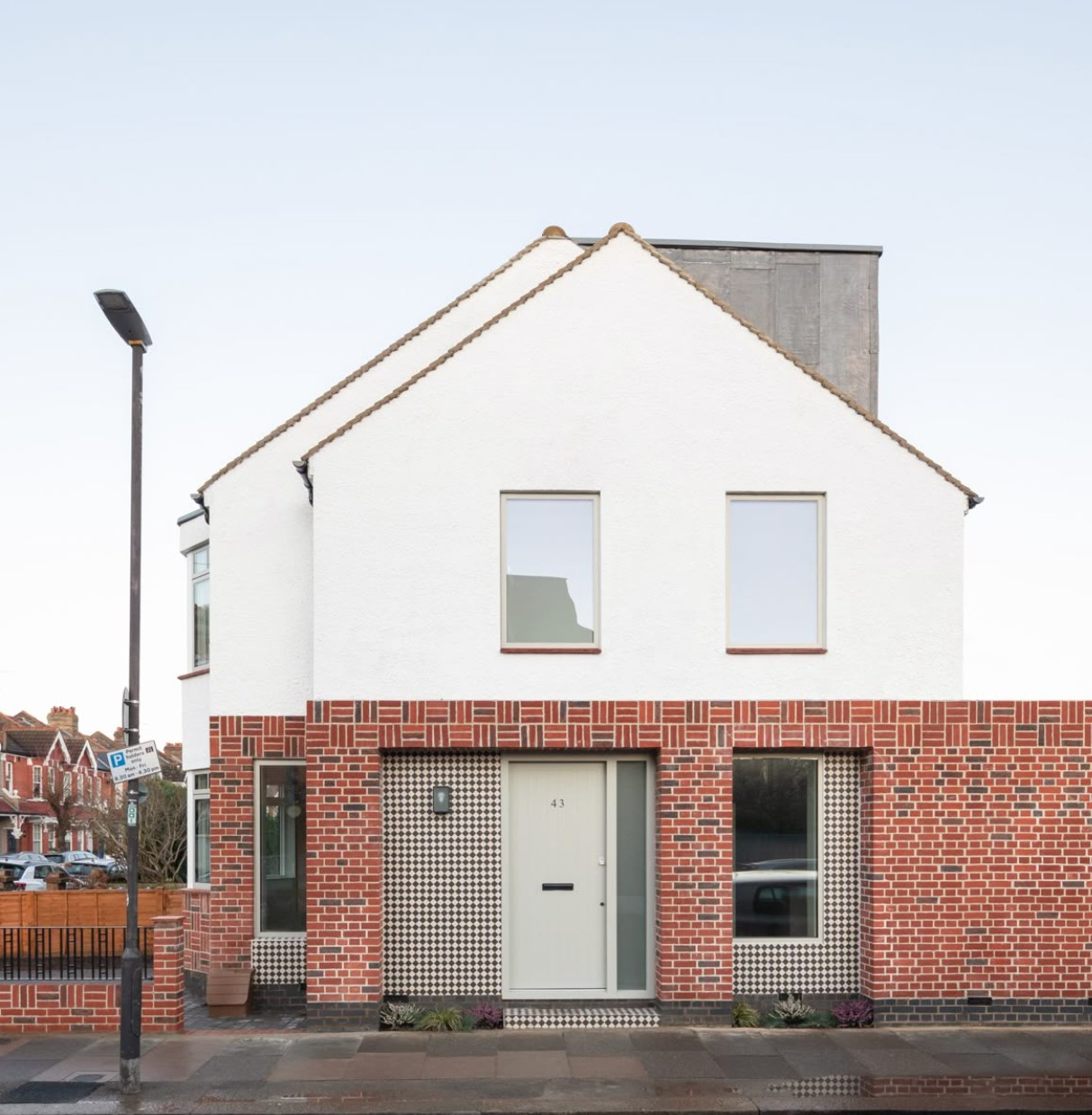 change the upper facade to a more colourfull plaster and the the lower facade be with a red tile and dark mortar
