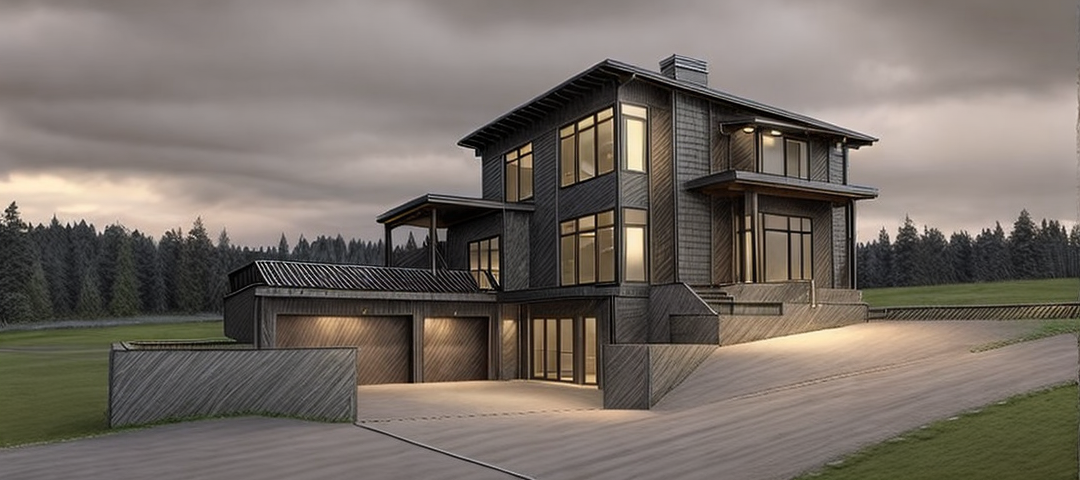 gravel drive to garage door farm setting with wildflowers in the yard add more light to pergola porch on left side of house zoom out slightly sunset add lights either side of garage door and column by front door on rock