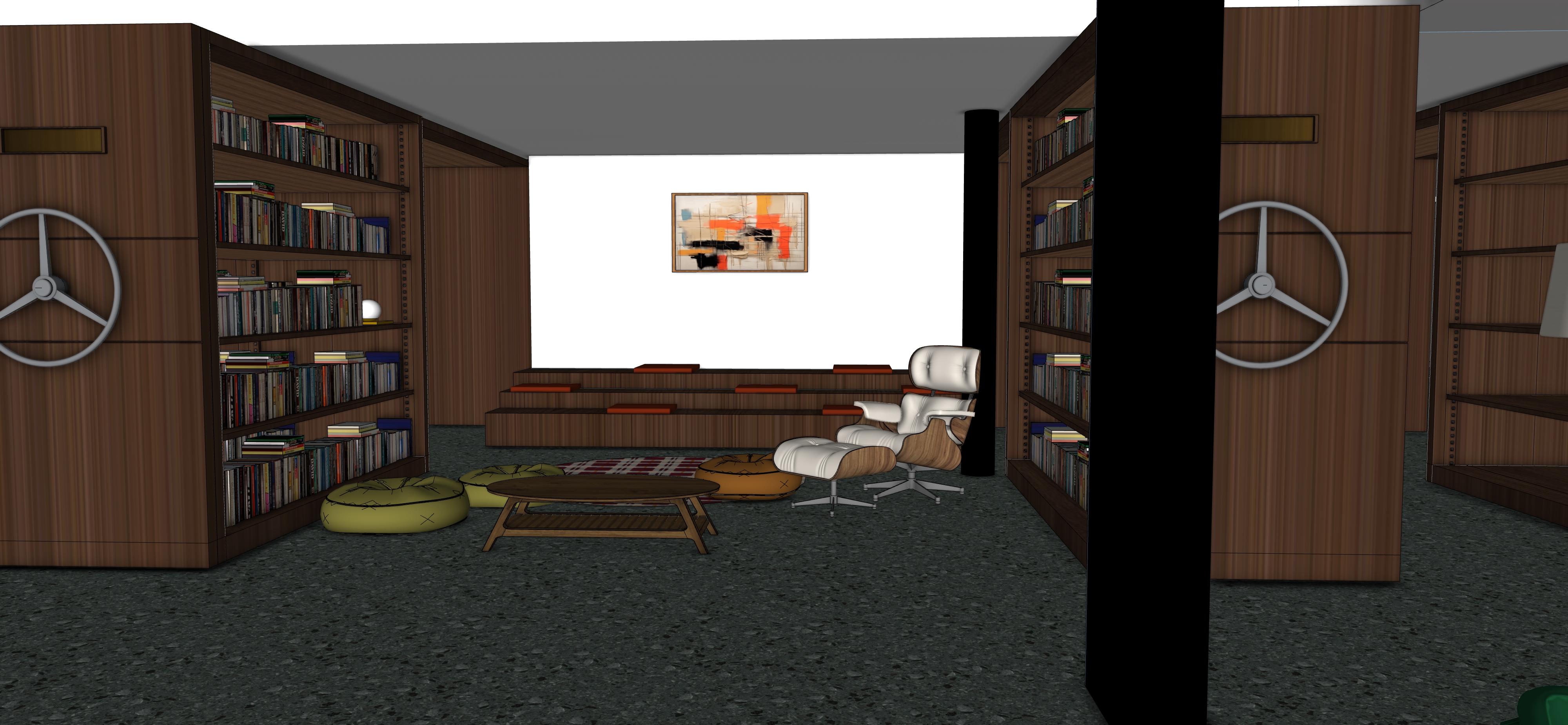 warm and intimate architectural interior scene mid century modern reading lounge rich walnut wood bookshelves integrated seating platforms tactile natural materials soft indirect ambient lighting combined with warm accent lights 2700k glowing table lamps and sculptural pendant lights calm and refined atmosphere add people naturally interacting with the space one person sitting and reading on the platform seating another browsing books relaxed and quiet behavior slow and contemplative mood natural human poses elegant and minimal clothing in neutral tones lighting is cinematic and atmospheric inspired by editorial interior photography warm light gradients soft shadows gentle contrast cozy and inviting feeling no harsh lighting no overexposure photorealistic high end architectural visualization editorial style realistic materials global illumination soft depth of field professional interior photography scandinavian and mid century modern influence