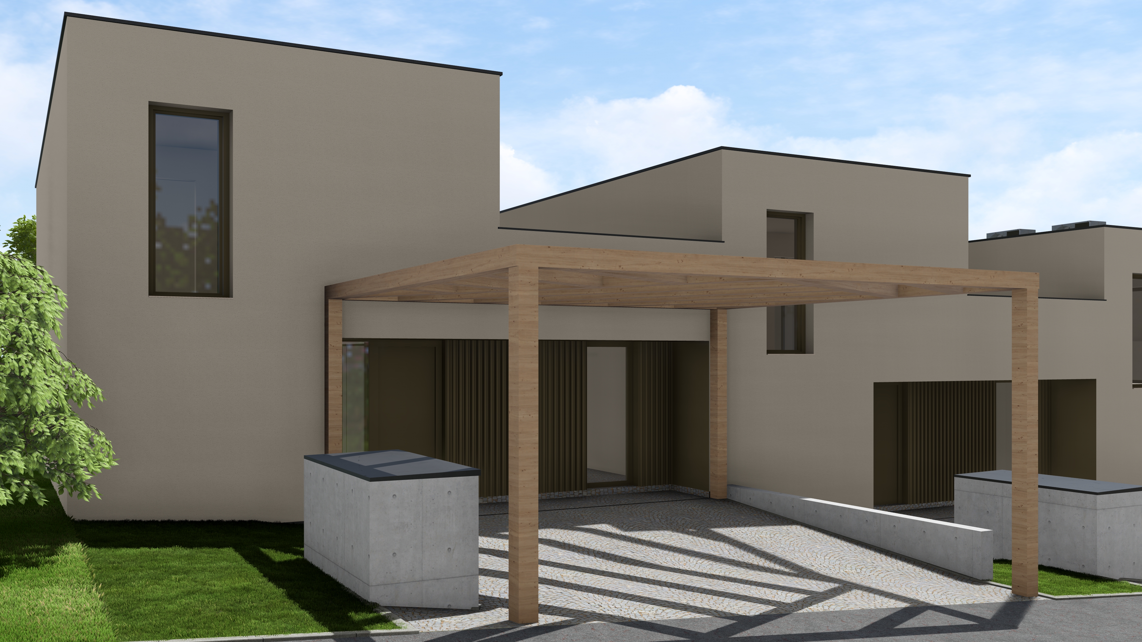 a photorealistic architectural photograph based on the input image showing the building exterior under warm golden afternoon sun the existing facade materials colors and architectural details including window frames and cladding must strictly retain their exact shades and appearance from the source image glass doors or large windows are slightly ajar or transparent revealing glimpses of a modern warmly lit furnished interior to add depth and life the surroundings feature lush high quality landscaping the grass is detailed showing individual blades and trees or plants have vibrant realistic textures day sunlight realistic shadows highlighting material textures cinematic atmosphere highly detailed