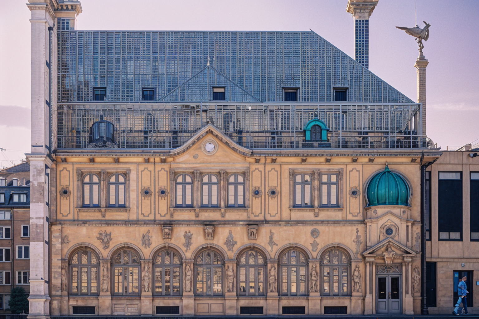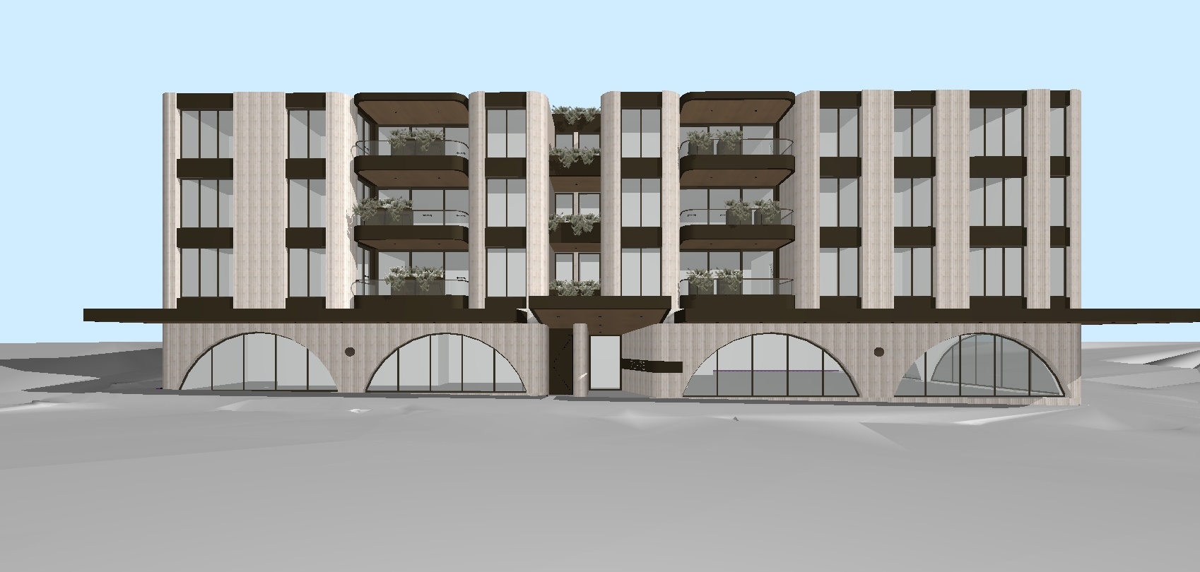 the external cladding is flutted vertical stone the dark cladding is bronze colour add a street in front of the building with cars and pedestrians