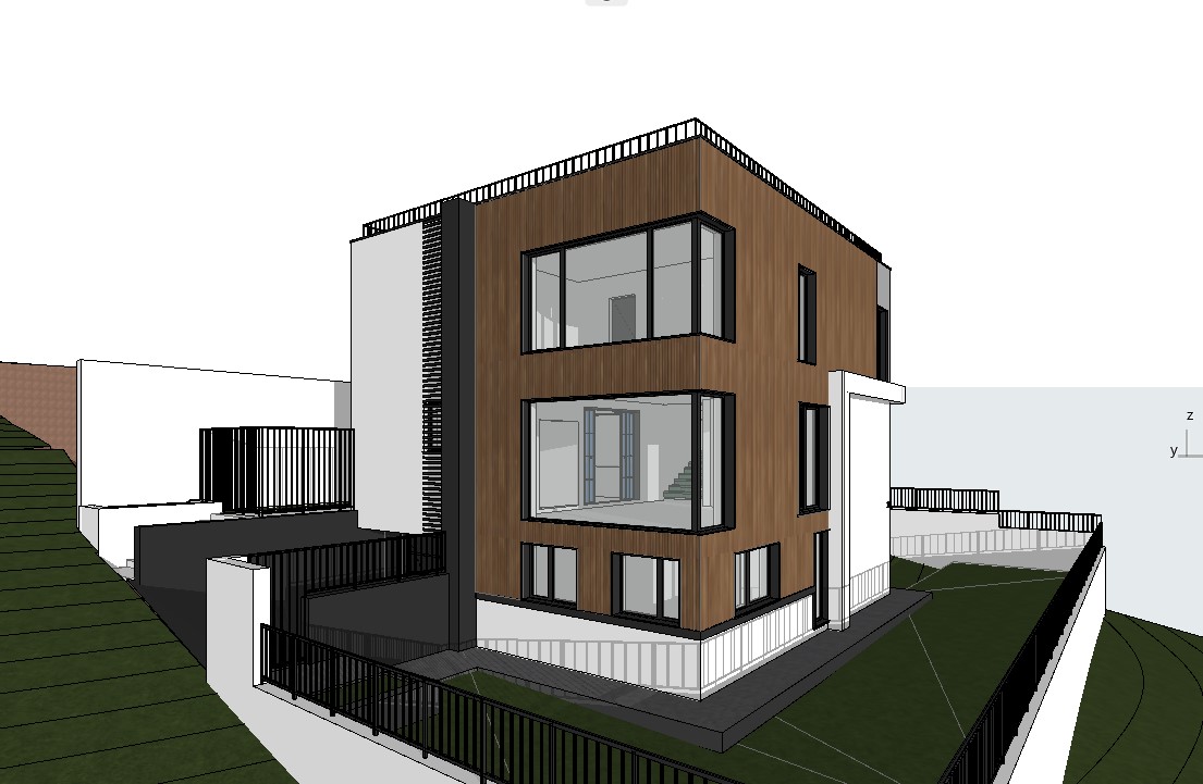 modernist exterior shot a beautifully rendered modern minimalist house set amidst a serene natural environment the house features angular wooden structures with a dark gray and black exterior large glass windows reflect the subtle hues of the surrounding landscape the wooden siding has warm earthy tones like soft browns and is combined with sleek contemporary black trimming the atmosphere is tranquil and the lighting is soft mimicking a gentle morning or late afternoon light the ground is adorned with patches of green moss and vivid yellow wildflowers adding a burst of color and life the surrounding trees are leafless drawn with delicate thin black lines indicating the late autumn season shadows of the trees create an intricate pattern on the house and the ground in varying shades of gray and brown the entire setting feels both modern and natural embracing simplicity and elegance architecture white facade keep windows from concept left side is slope road for cars