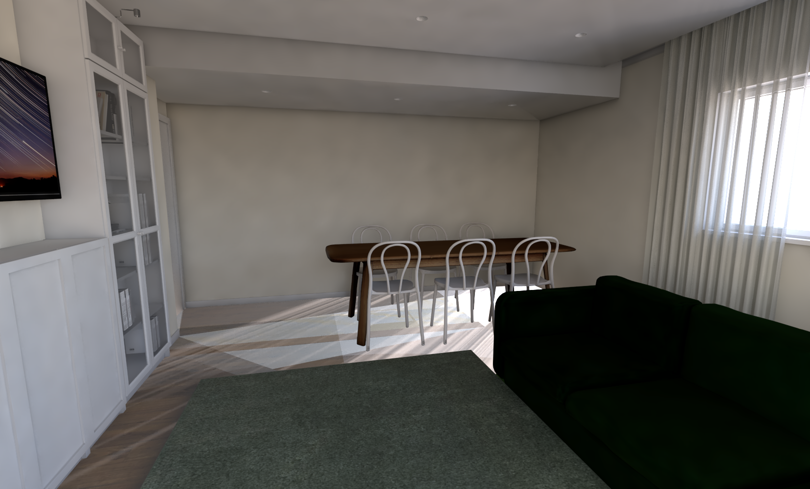 make a super faihful render from the image remove the wgite things on the floor under the table the flor is darker wood the carpet is darker mate green and the wall is white