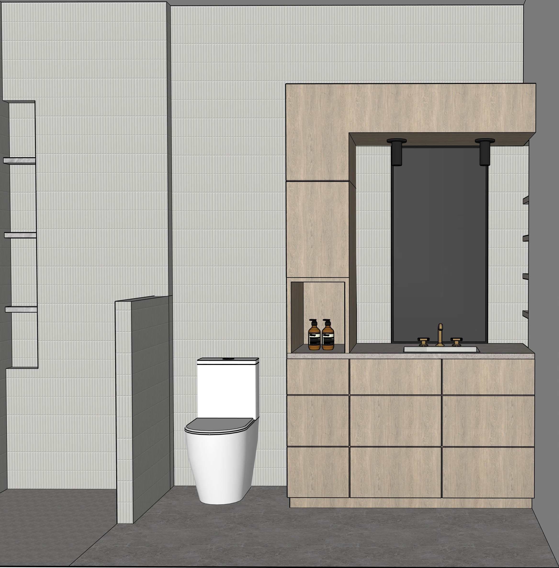 input more interior ceiling lighting and remove the natural lighting the shelves on the right of the vanity are recessed into the wall