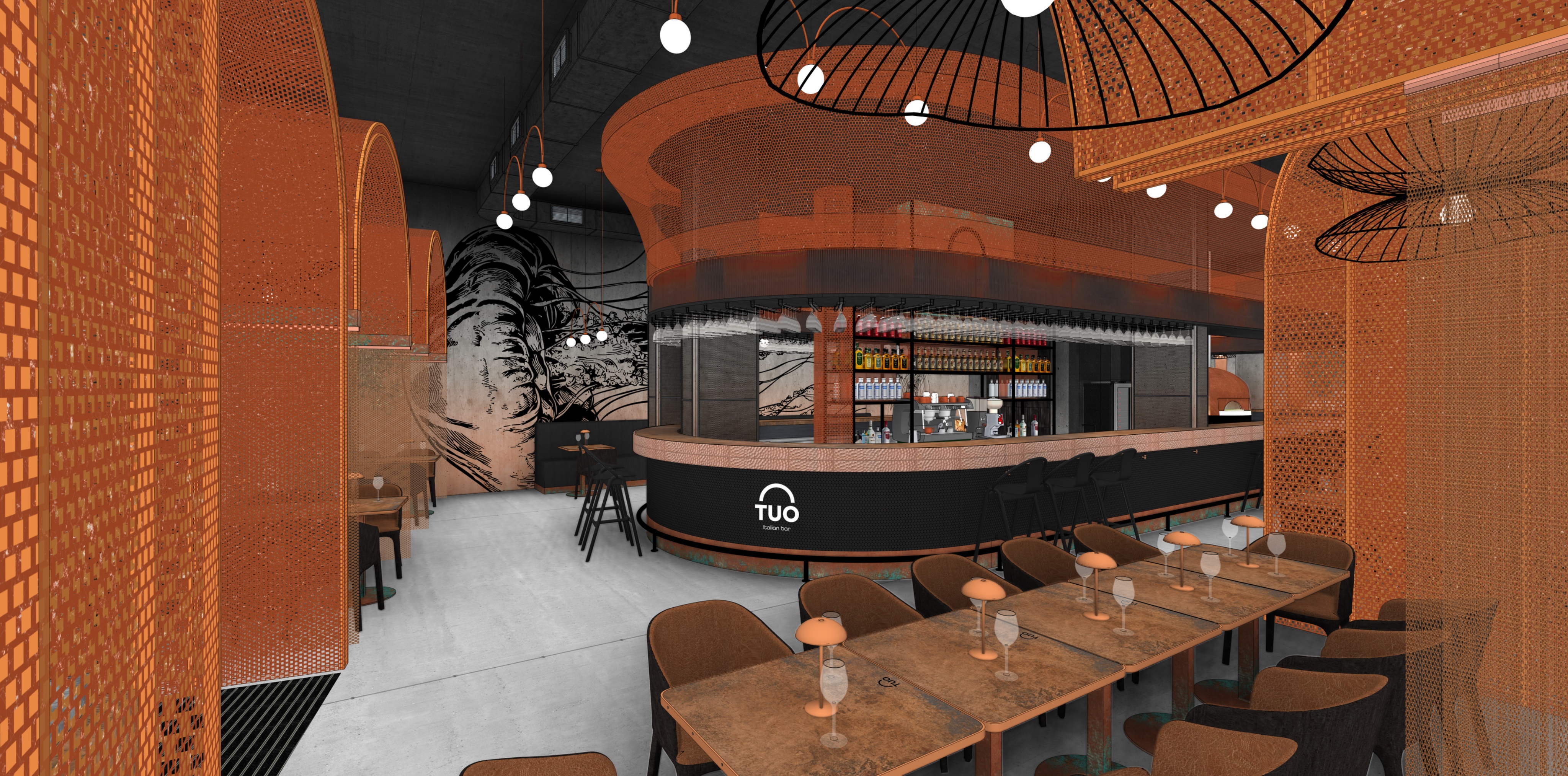 modern restaurant with cooper details and concrete floor and ambient lighting