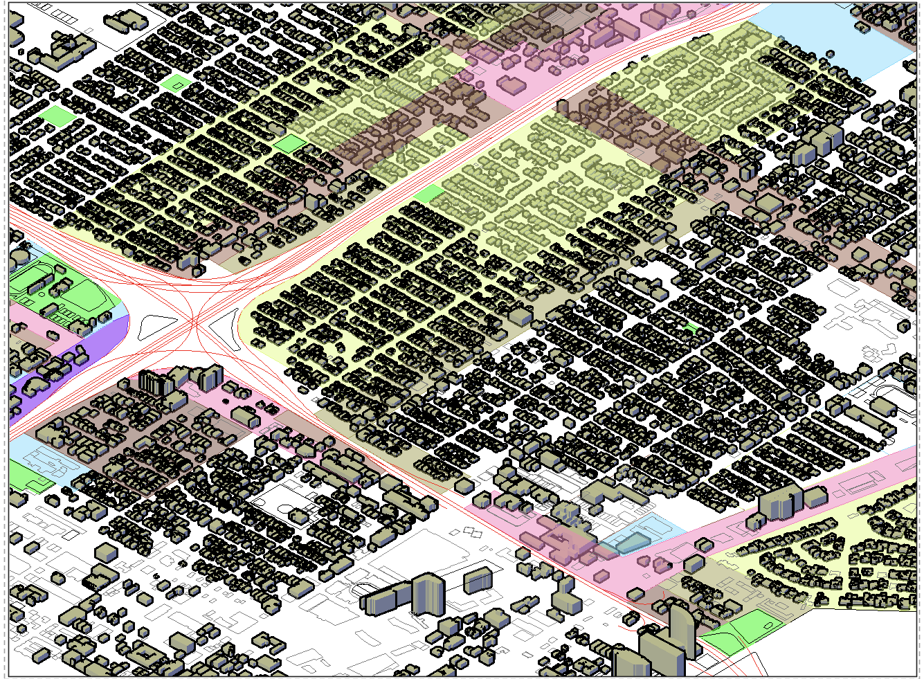 new urbanism aerial shot render this urban plan make sure to show building massing and the i 95 highway interchange architecture
