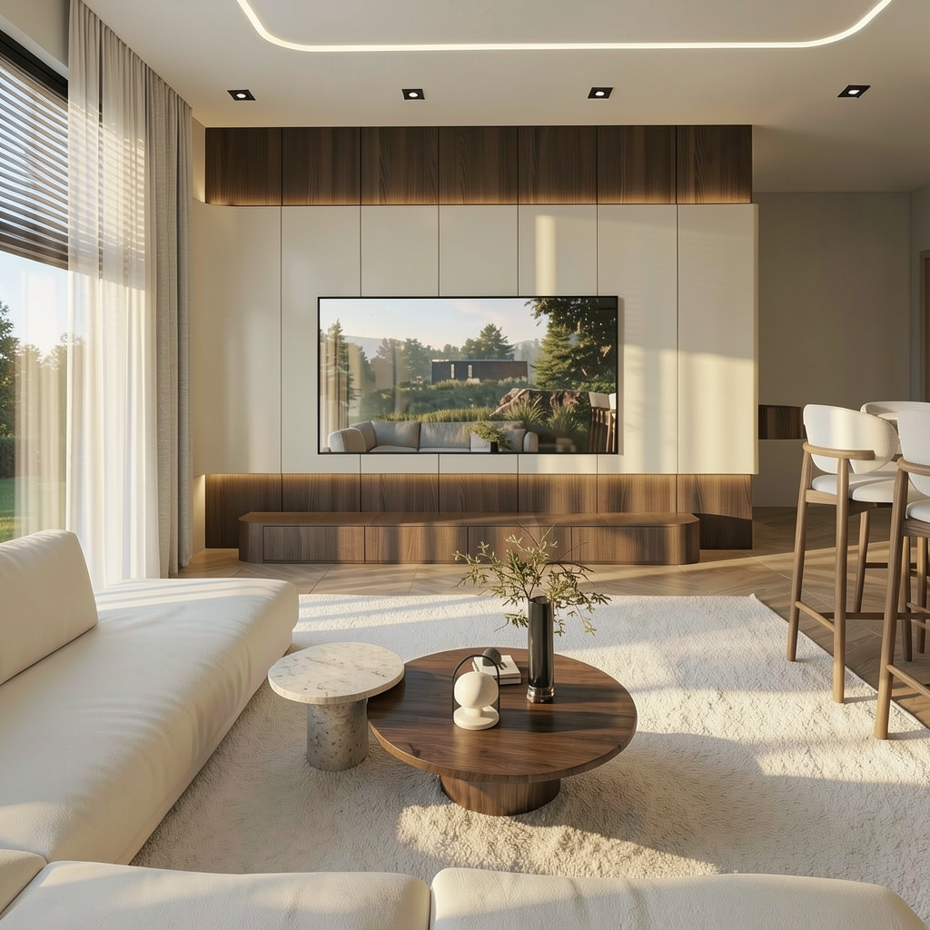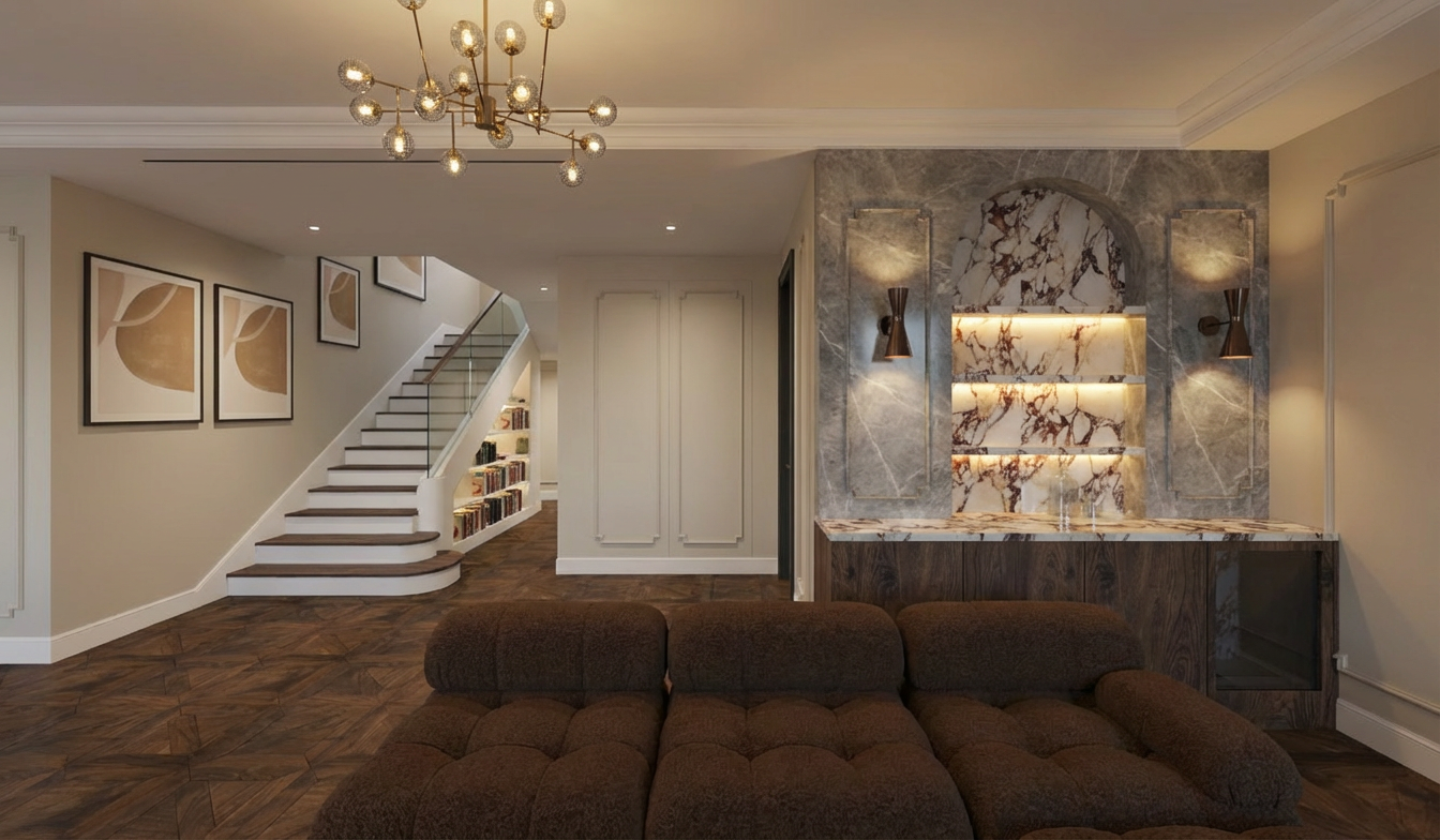 high end bedroom interior photography photorealistic cinematic lighting flooring wide and long thin wooden planks with subtle grooves light oak finish with a soft orange yellow undertone mist rubio monocoat finish oriented vertically towards the bed cabinetry bespoke wardrobe featuring doors in a light beige little greene portland stone dark 157 with grooves and plinths in a muted clay grey little greene elysian ground 320 the wardrobe includes integrated mirrors and dark wood accents heel grey rubio monocoat a deep brown grey wood with a smooth seamless texture and no visible grooves furniture matching nightstands in the same dark heel grey wood walls painted in a soft neutral grey sikkens f6 03 72 with the focal wall behind the bed covered in arte washed white textured wallpaper architecture interior doors finished in little greene elysian ground 320 lighting soft natural daylight streaming from a window on the right wall complemented by a warm gentle glow from a designer pendant lamp above the bed maintain the original painting as shown in the reference high detail 8k resolution architectural visualization style