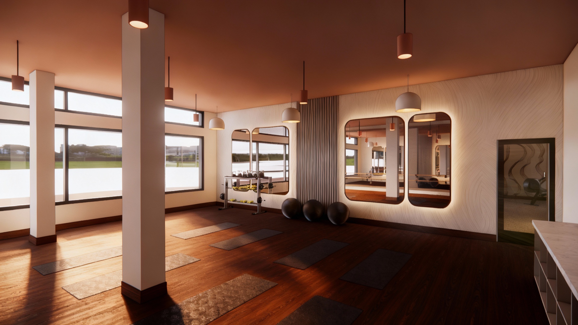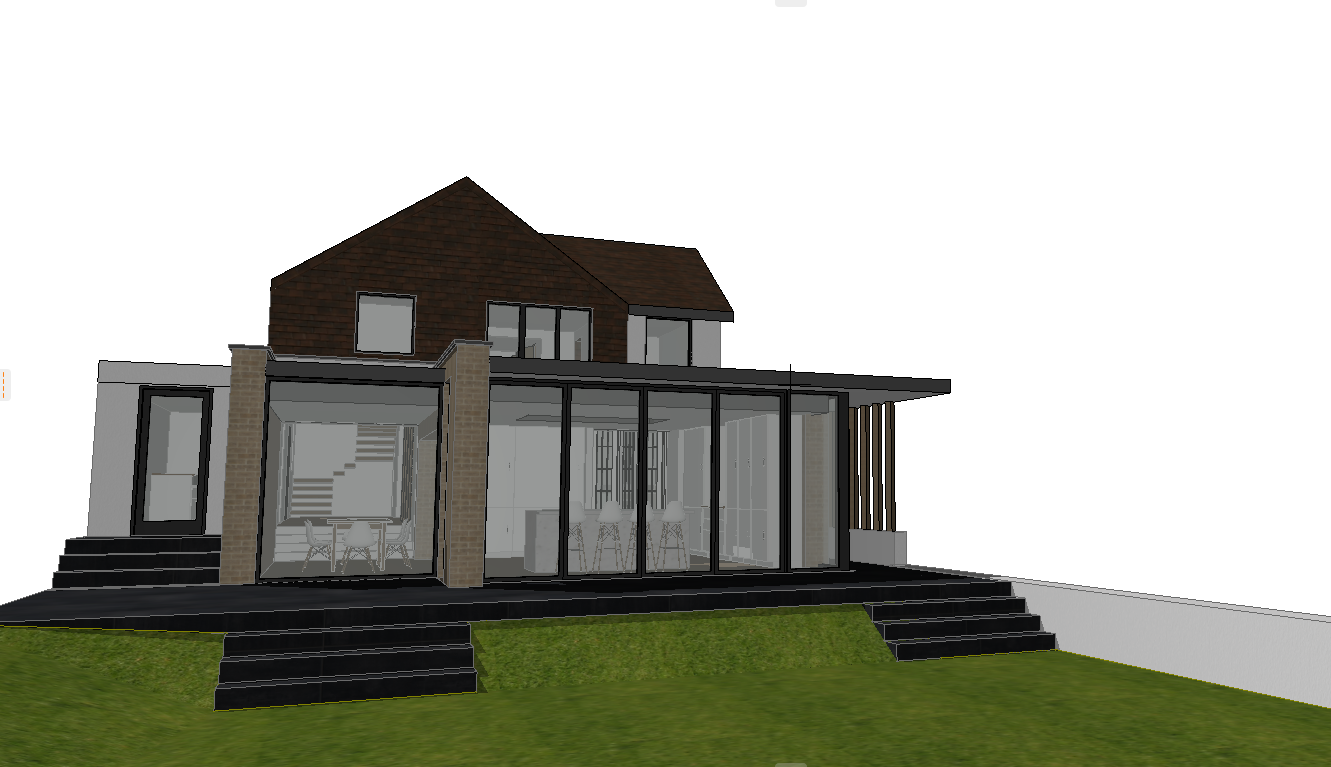 render a modern house with located in an urban area with brick house on left hand side a dark brown shingle roof light brown brick pillars and expansive glass windows the exterior walls should be a soft gray with black accents around the windows the stairs leading to the house are sleek and black while the lawn is a rich green set the atmosphere in a serene clear sky afternoon with soft natural lighting casting gentle shadows to enhance the architectural details