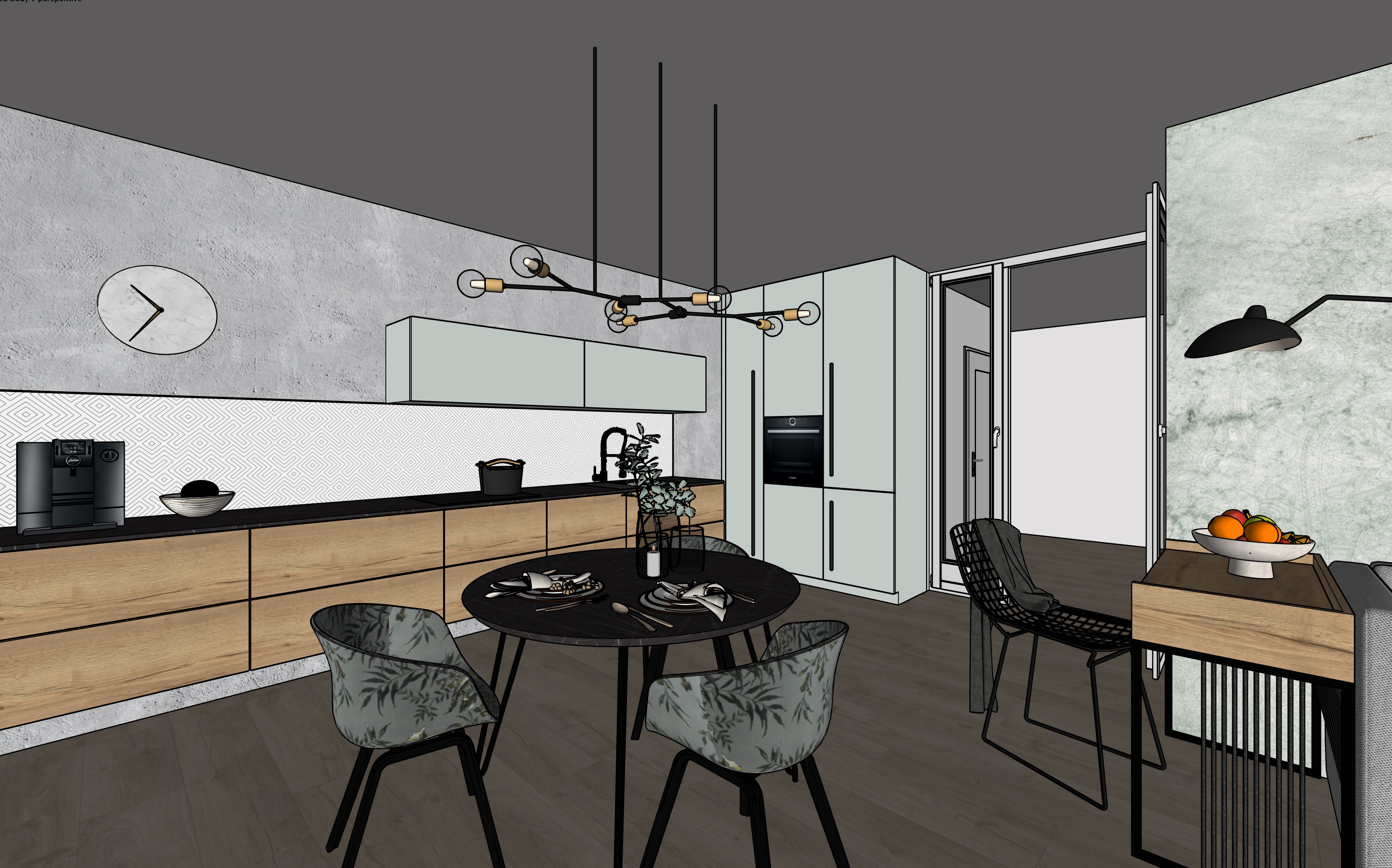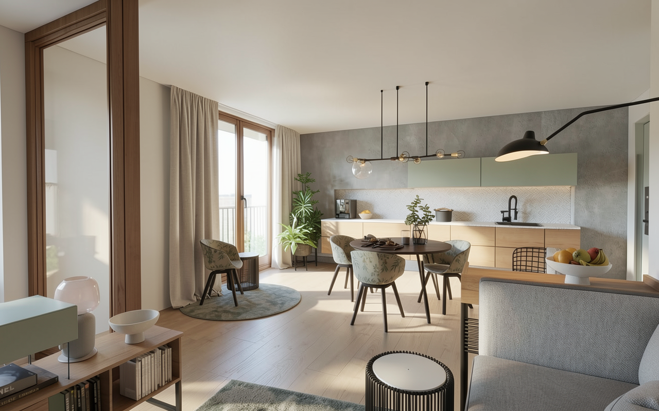 create a photorealistic interior photograph based strictly on the provided design visualization preserve the exact layout proportions furniture placement colors and all design elements without any changes or additions this is a realism enhancement task not a redesign use high quality natural materials with realistic textures wood fabrics matte surfaces and accurate detailing improve material realism while keeping original colors and finishes lighting should be soft natural daylight with subtle shadows creating a warm inviting atmosphere use balanced exposure realistic highlights and no overexposed areas add gentle ambient light for depth maintaining a cozy and harmonious mood camera should mimic a professional interior photography shot eye level perspective 24 35mm lens equivalent sharp focus high dynamic range and natural depth ensure high resolution clean composition no distortion no added objects and no stylistic reinterpretation the result should look like a real photograph of the exact designed space b l deska na st n m jemn grafick ernob l vzor