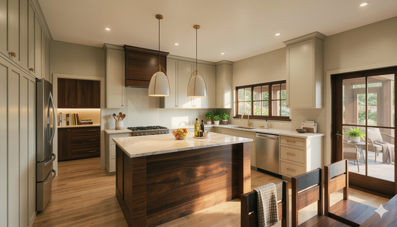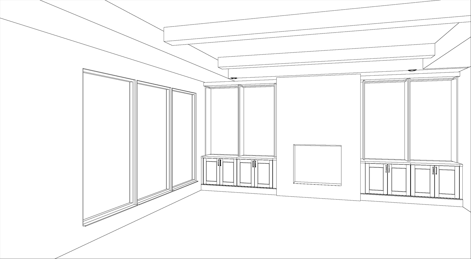 a modern living room interior with a cozy and elegant atmosphere the walls are painted in a soft ivory color to create a warm and inviting space the ceiling features exposed wooden beams in a rich walnut finish adding a rustic touch large windows with soft flowing white curtains allow natural light to flood the room the cabinetry is sleek with a matte walnut to match the beams finish and black handles with thick back light shelves in leds the floors are a matte light oak complementing the overall color palette a minimalist fireplace with a light gray stone surround and a mantle with a tv above is the focal point enhancing the modern aesthetic the overall atmosphere is serene and sophisticated perfect for relaxation