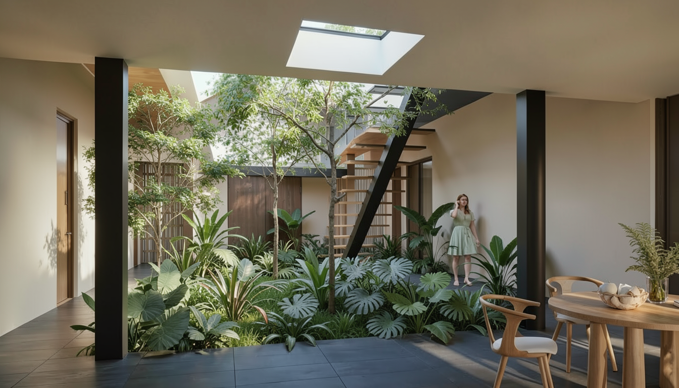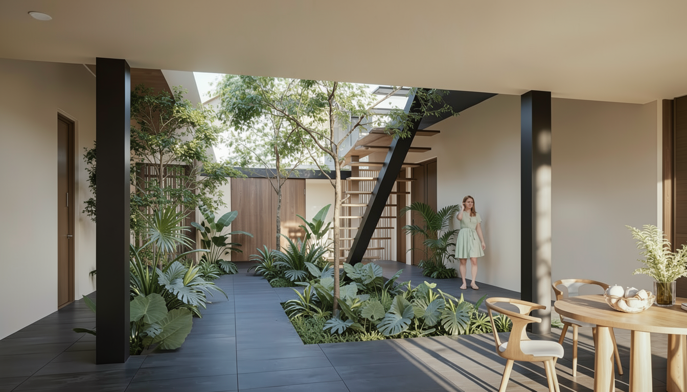 contemporary tropical courtyard house open central patio with skylight indoor garden with abundant vegetation large leafy tropical plants covering the ground completely replacing any stepping stones or hardscape paths seamless green garden clean modern lines dark grey stone tiles surrounding the garden light wood finishes black metal columns floating staircase with wooden steps soft natural lighting warm beige walls japandi style calm atmosphere architectural render photorealistic high detail 8k