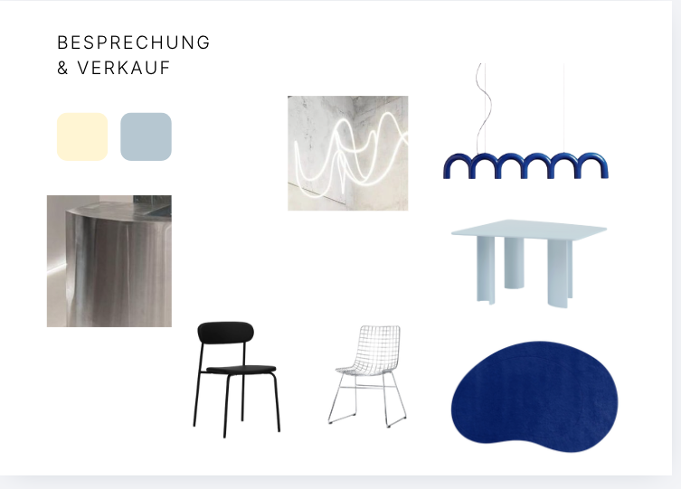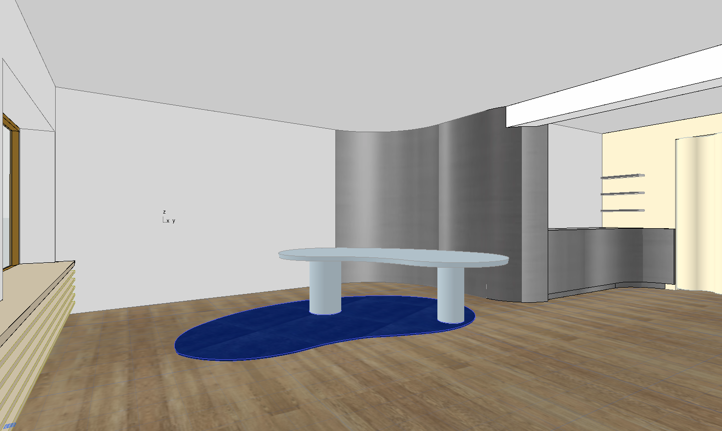 exterior shot please place five chairs around the table three black chairs and two aluminum chairs as shown in the moodboard both pendant lights should be included one should be centered above the table and the second one should act as an accent light in the foreground the flooring should follow the wooden plank material and color shown in the references the color palette should be based on the moodboard including soft neutral tones combined with muted blue accents the back wall should be designed as a curved surface creating a smooth and continuous spatial flow the kitchen area should be finished in an aluminum stainless steel look with a clean and slightly reflective surface at the back right side of the kitchen a curtain in a soft butter yellow tone should be added the adjacent wall should be painted in the same butter yellow color the overall atmosphere should be bright and positive with natural daylight entering from the window sunlight should softly illuminate the space creating a warm and inviting mood the image should no longer look like a cad or schematic model it should be transformed into a photorealistic interior visualization use realistic materials with natural textures and subtle imperfections add soft shadows reflections and depth to enhance realism lighting should feel natural and atmospheric with daylight entering the space and creating gentle highlights and soft contrasts surfaces such as wood fabric and metal should have a tactile realistic appearance overall aim for a warm high quality interior rendering rather than a technical or diagram like image