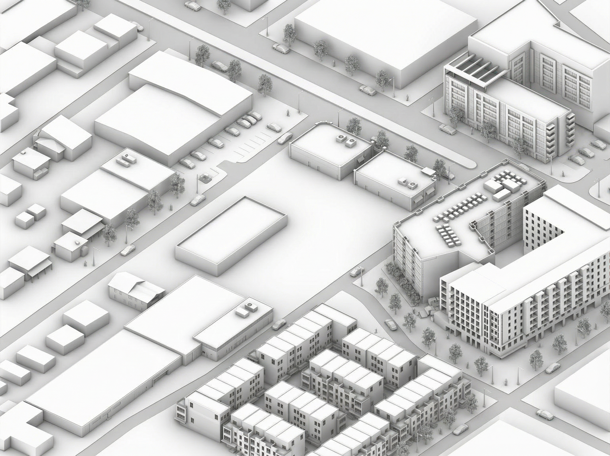 do not change any existing geometry camera angle or overall massing maintain the crisp white light gray clay render style with no color no textures no fog and no softening make the following updates trees add additional clay model trees in the open gaps between buildings especially along internal property edges where vegetation would naturally be keep all trees monochrome white light gray and correctly placed on ground never in the road streetlights ensure streetlights are evenly spaced along all sidewalks and road edges keep them simple clay model poles with no shine or detail rooftop equipment remove rooftop hvac units only from the two small middle commercial buildings along the blank site s northern edge keep all other rooftop equipment on all other buildings exactly as is do not add new hvac to any of those middle buildings style maintain crisp edges and light ambient occlusion only do not add cars people or any new objects unless already present leave the central site parcel completely empty final result should be the same scene but with added trees in the gaps evenly spaced streetlights and the two middle buildings having clean flat roofs with no mechanical equipment