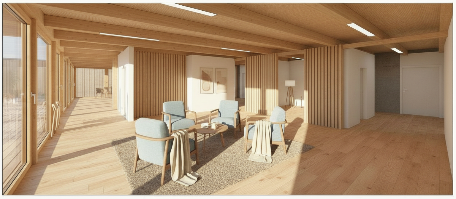 add 2 elderly people sitting in the chairs and one sitting in a wheelchair the rest should stay as it is