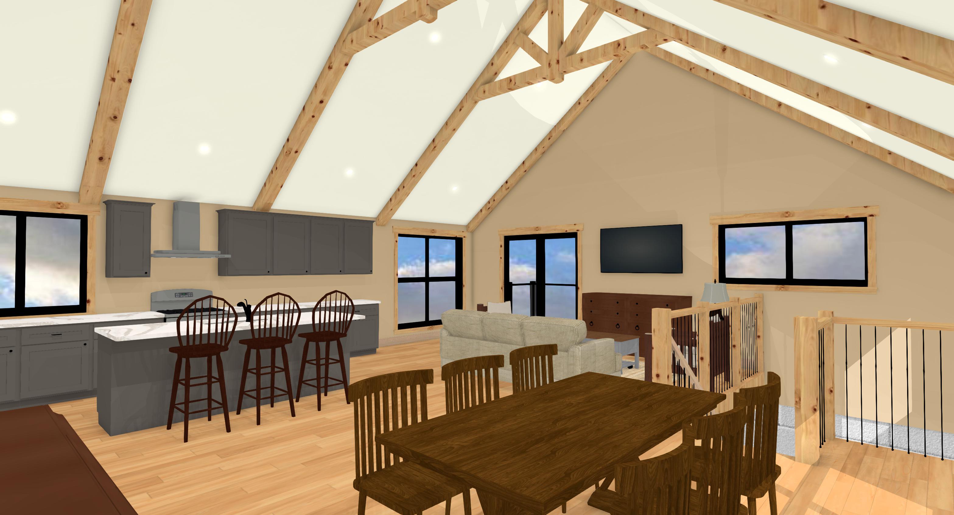 make this render look realistic light brown stain the wood beams in the roof and the truss add some items on the table tops add some modern paintings to the walls