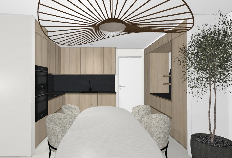 prompt render a contemporary kitchen dining space with a soothing and elegant atmosphere the room features light oak cabinets with a soft beige finish the countertop and backsplash are in a sleek matte black highlight a modern artistic light fixture on the ceiling with a bronze and white color scheme the dining chairs upholstered in a textured light grey fabric surround a glossy white oval table on the right add a vibrant lush indoor olive tree in a dark grey pot enhancing the natural feel ensure the lighting is warm and inviting casting soft shadows and a cozy ambiance throughout the space