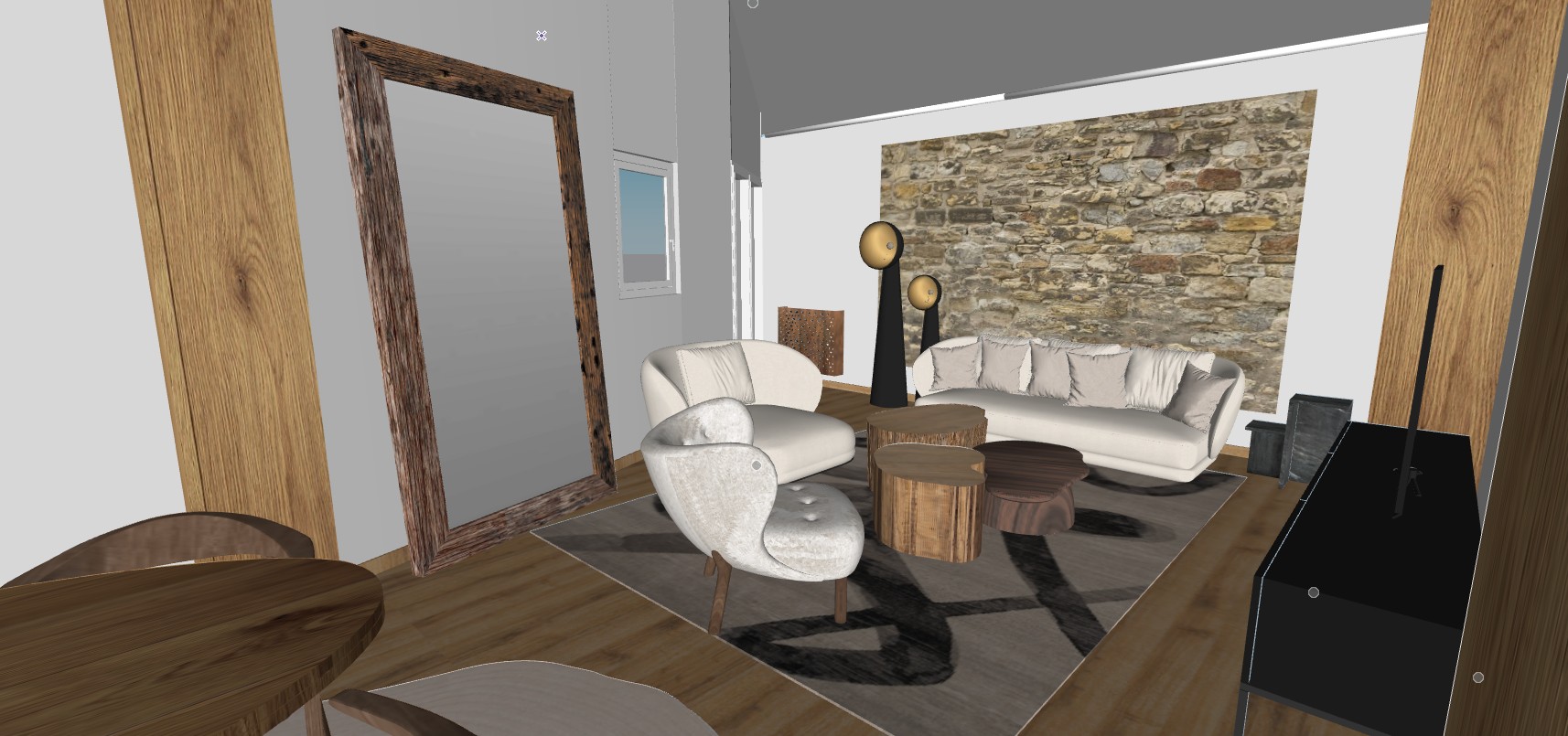 el muro de madera del fondo poner un marco de luz led enmarcando la madera natural y en las ventanas colocar cortinas de seda con una caida natual y con movimineto sutil generar una hambientacion calida