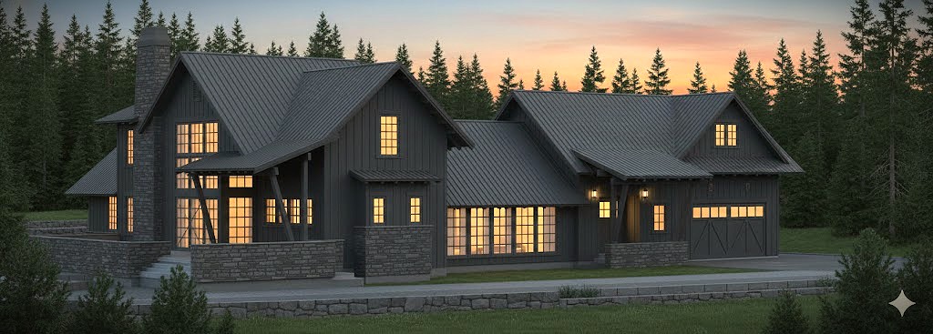 exterior shot stone chimney tress in background