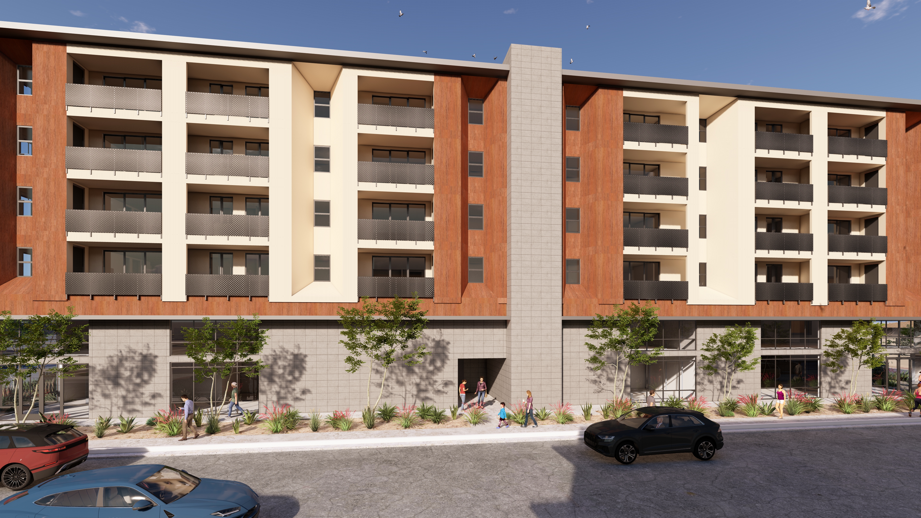 realistic rendering sunny weather arizona realistic people realistic glass reflections realistic asphalt details and cars realistic vegetation stucco and corten facade