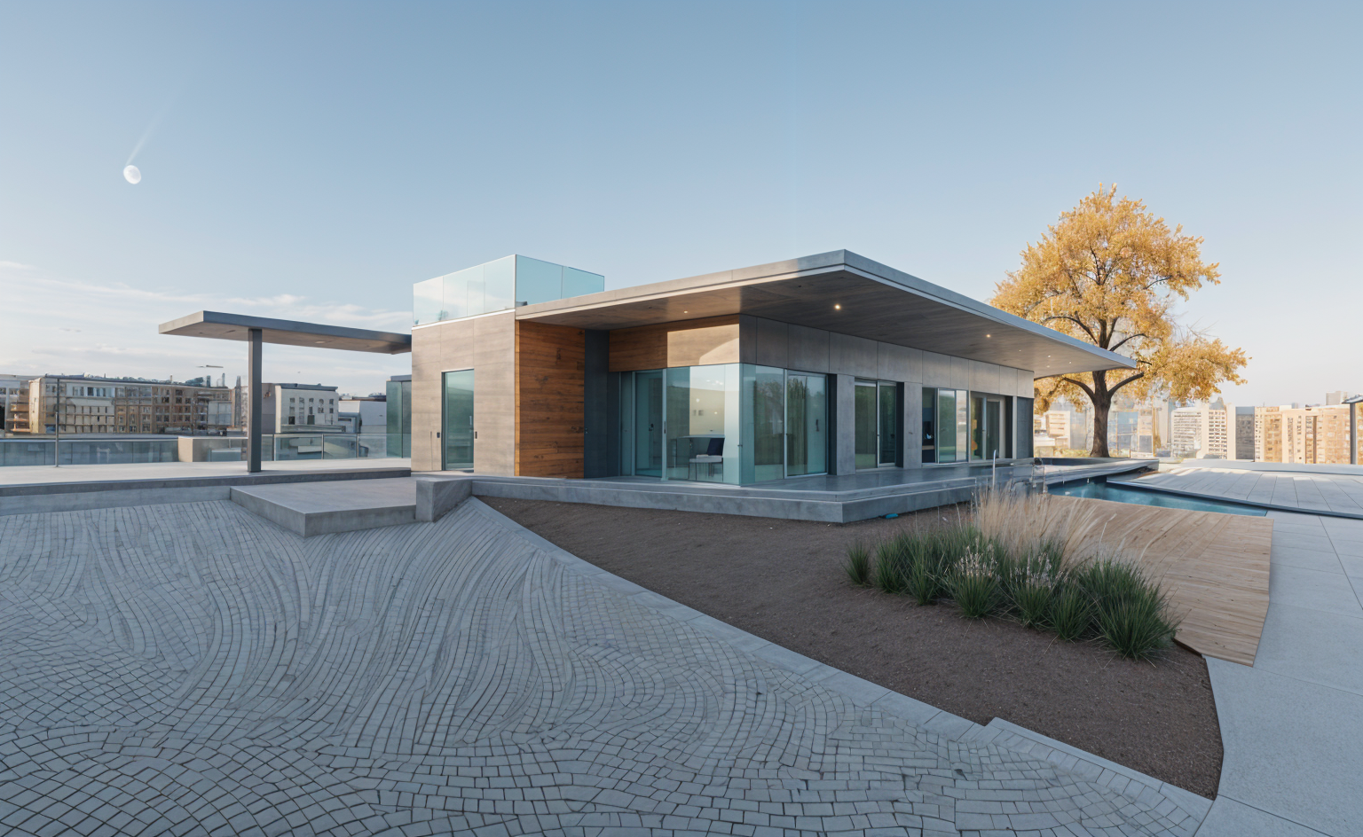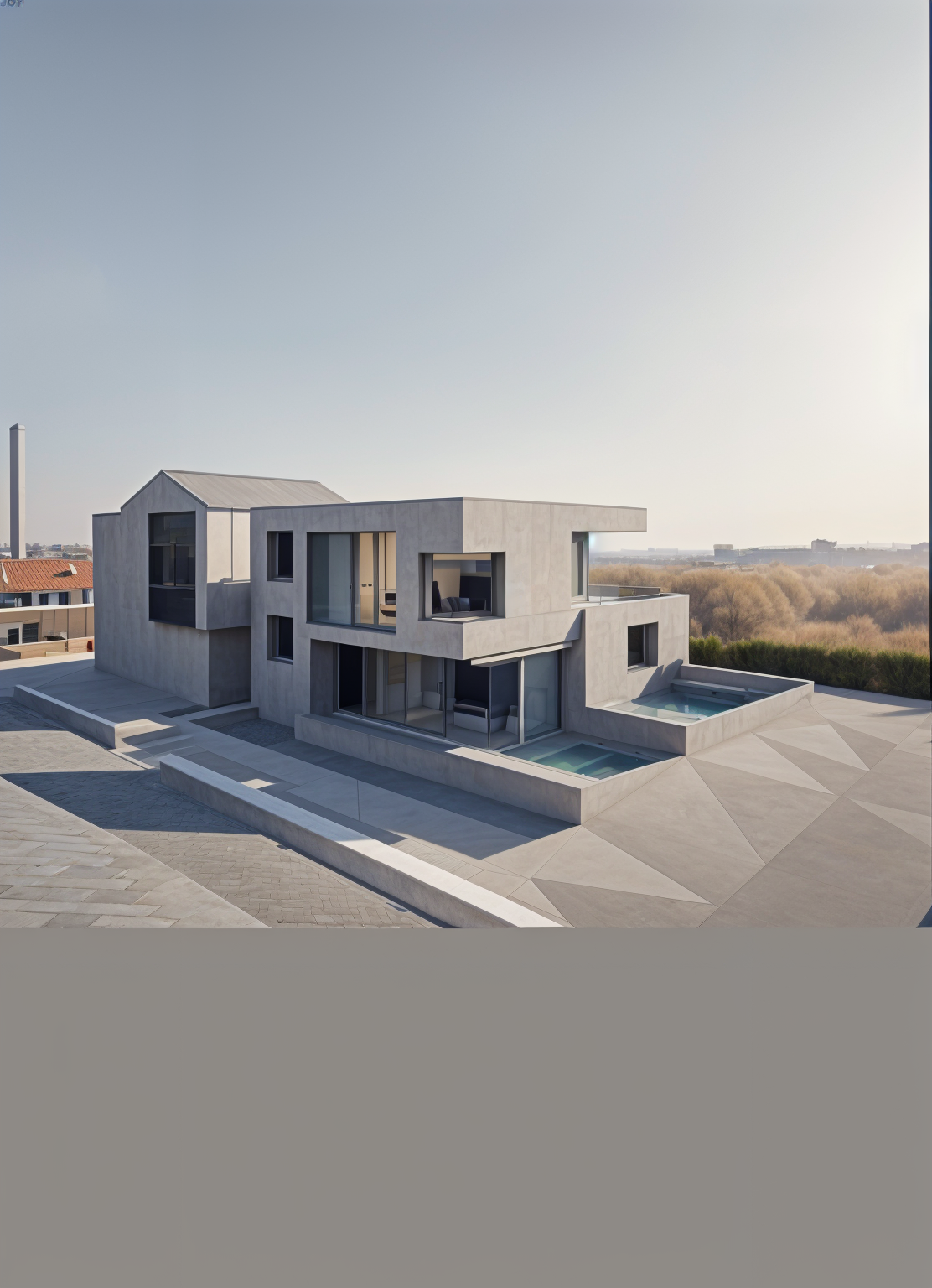 modernist exterior shot bricks suburb few trees architecture