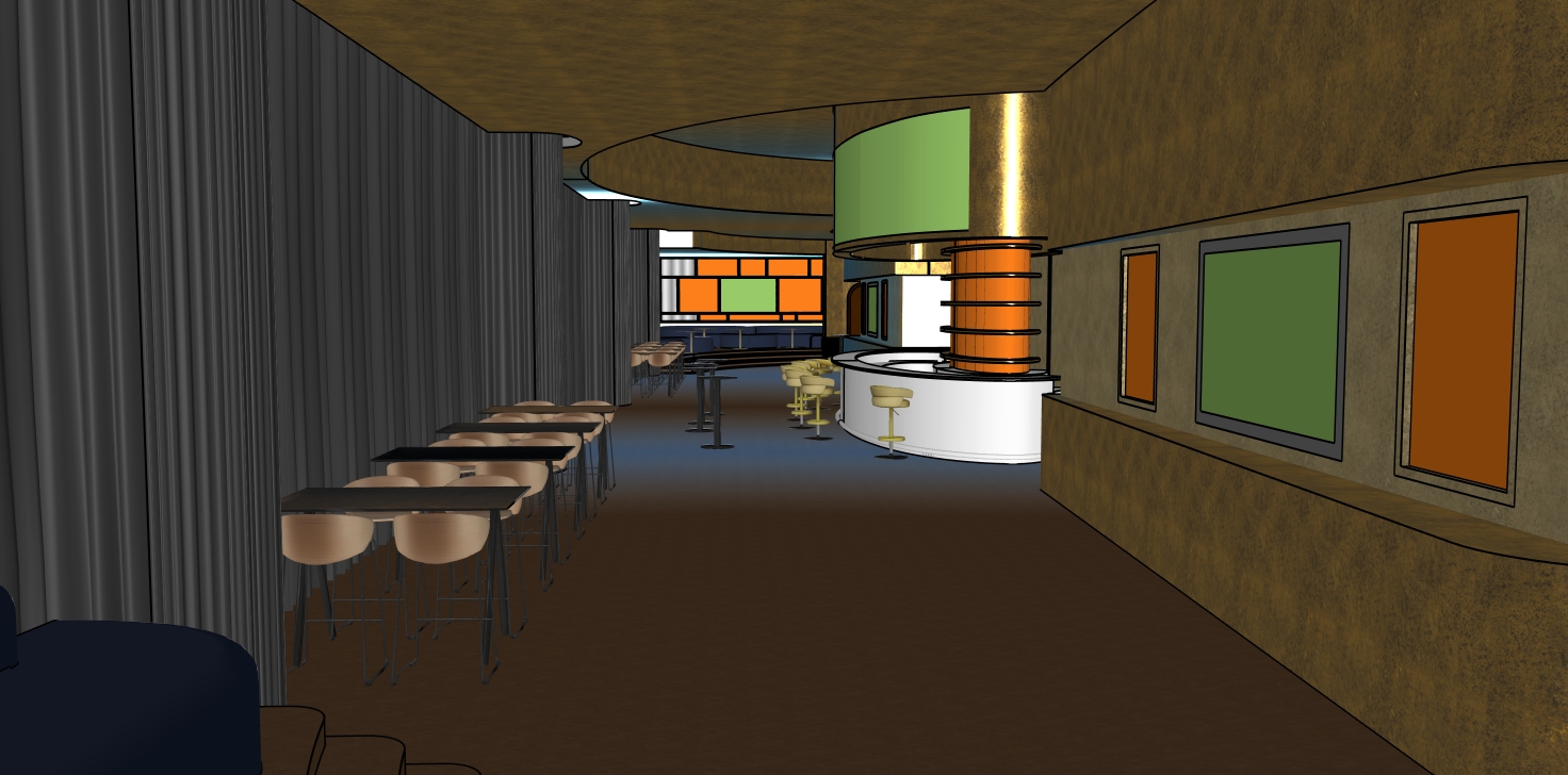 modernist exterior shot photorealistic render generated from the provided sketchup 3d image as a reference strictly respect the original geometry volumes proportions architecture and all furniture visible in the source image the project represents a vip lounge located inside a football stadium with no exterior openings the space is intentionally dark enclosed and immersive lighting must be exclusively artificial with no natural light use warm soft indirect lighting that is elegant and controlled enhancing volumes and materials without overexposure the atmosphere should feel refined intimate and high end like a formal private lounge with a luxurious mood in gold amber and warm golden tones strictly preserve the original material colors color tones coming from the sketchup image textures must be interpreted in a realistic high quality way while keeping the exact original colors unchanged fully respect the color coding system present in the reference image all furniture visible in the sketchup image must be kept exactly as is no furniture decorative objects lighting fixtures screens or architectural elements may be added removed or modified color flats are functional placeholders and must be replaced only as follows any green rectangular shape must be replaced with realistic football related content such as a live tv broadcast of a football match replays or stadium atmosphere integrated credibly as a television screen any orange rectangular shape must be replaced with realistic mirrors with reflections consistent with the artificial lighting and surrounding space archsynth must take no artistic freedom do not add anything that is not explicitly requested in this prompt or clearly visible in the original sketchup image no people no implied objects no additional elements final render must be clean realistic elegant and strictly controlled architecture