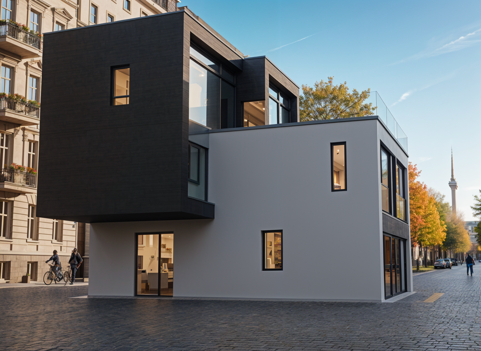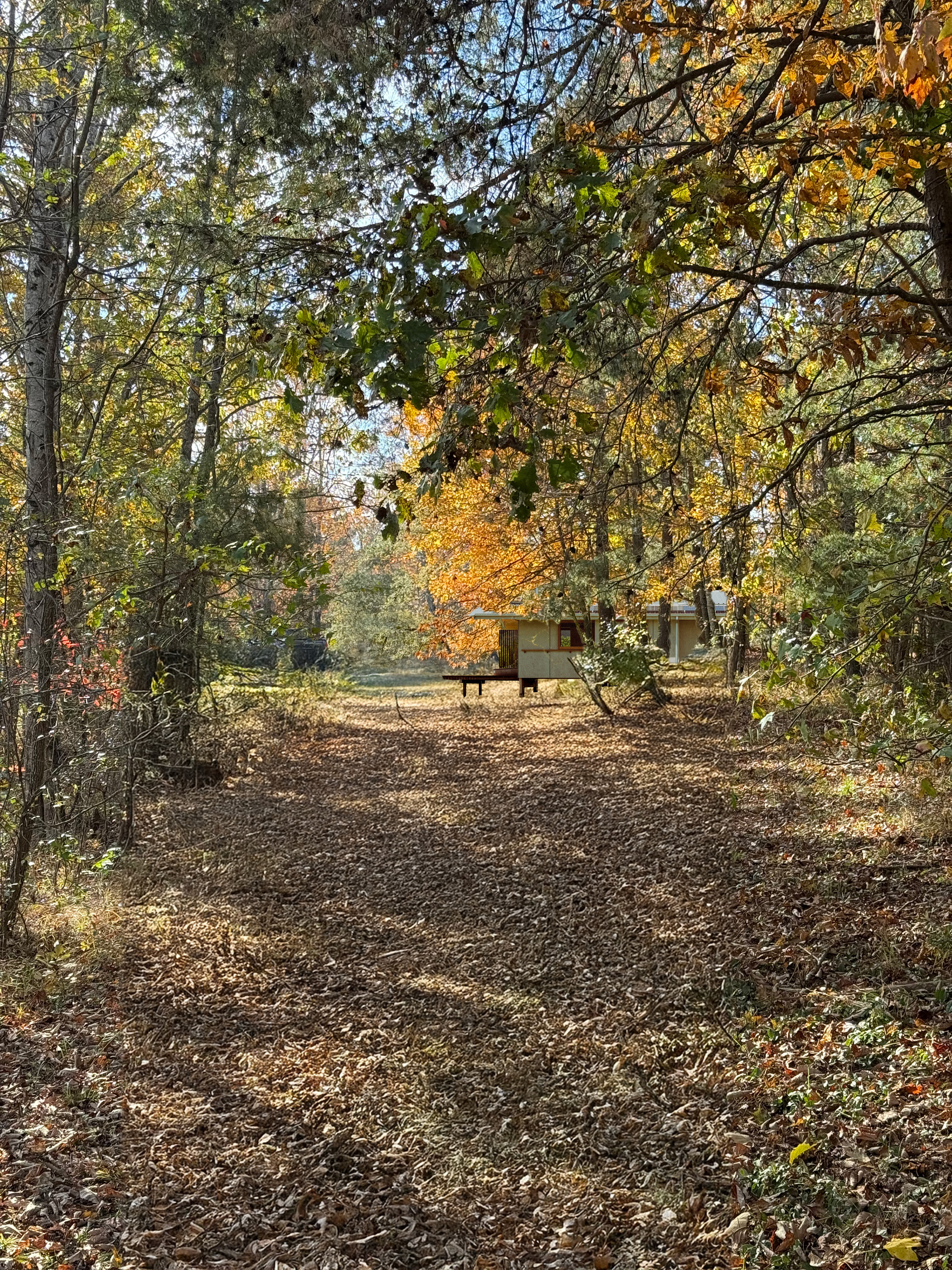 a serene forest path in autumn with golden and amber leaves scattered on the ground the trees are tall with a mix of deep green orange and yellow foliage allowing soft sunlight to filter through a small wooden cabin is nestled in the clearing its rustic brown blending harmoniously with the natural surroundings the atmosphere is peaceful and tranquil with a gentle breeze rustling the leaves the sky is a clear soft blue providing a calm backdrop to the colors of the forest