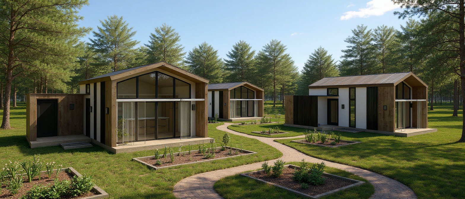 render a situation map with a lot of these mini houses colonial garden project in norwegian nature